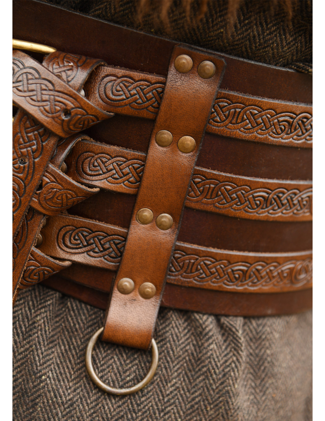 Sein Design ist ebenso faszinierend wie funktional. Bestehend aus drei einzelnen Gürteln, die mit einem breiten Mittelstück verflochten sind, passt sich dieser Gürtel perfekt an Ihre Taille an und bietet außergewöhnlichen Komfort. Das zentrale Stück, das den Lendenbereich umfasst, ist mit einem komplexen keltischen Knotenmuster geprägt, einem Symbol für Verbindung und Ewigkeit, verziert mit bronzefarbenen Beschlägen in Drachenform, die Ihrem Outfit einen legendären Touch verleihen und die Gegenstände am Gürtel schützen. Sehen Sie sich das Bild an – erkennen Sie die verschlungenen Knoten und die robuste Naht? Das ist vikingerische Handwerkskunst in ihrer besten Form.