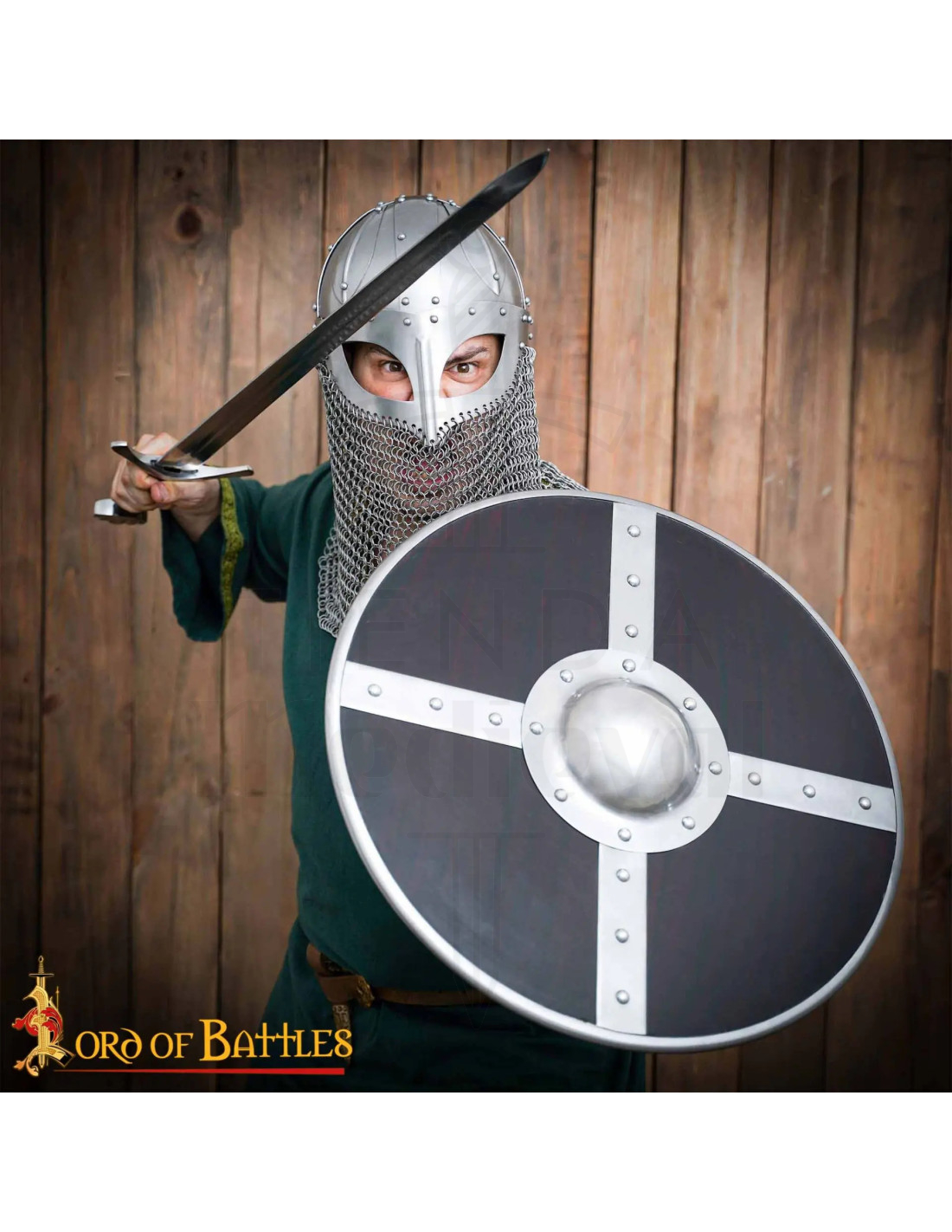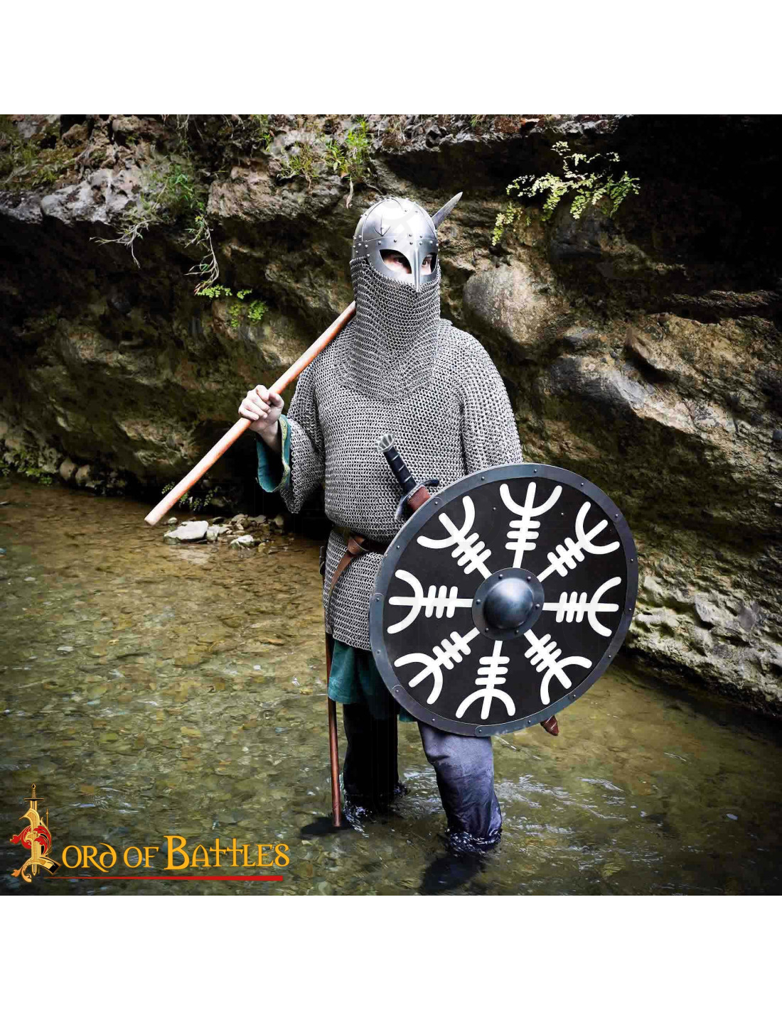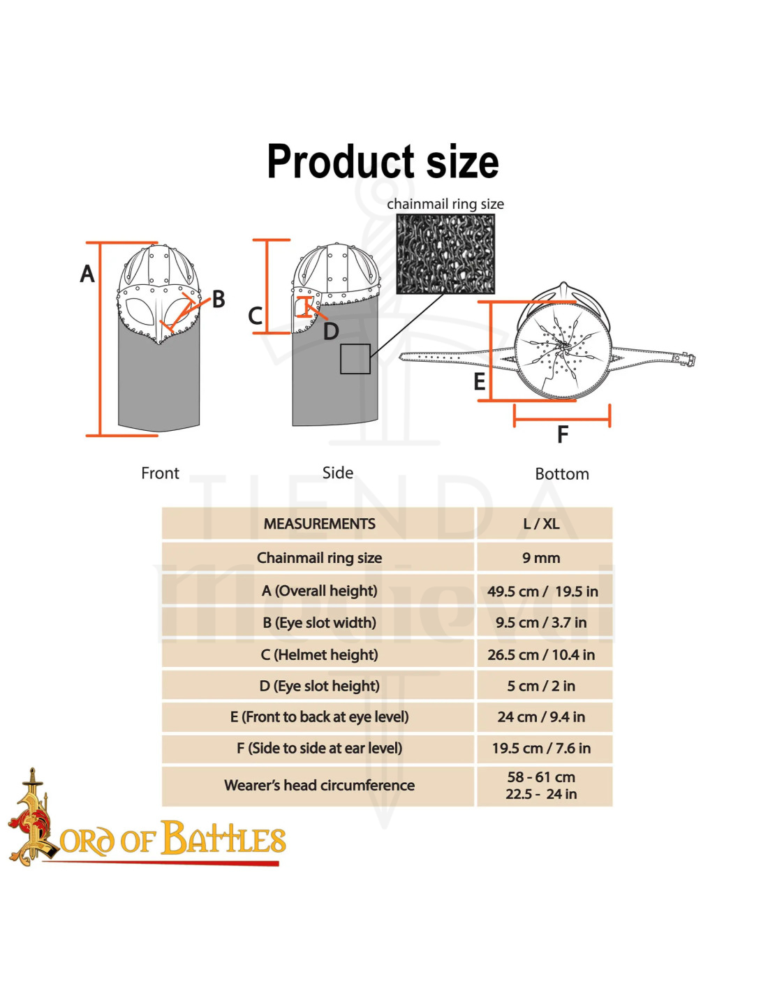 Außerdem wird jeder Helm sorgfältig mit einer Ölschicht behandelt, um vor Rost zu schützen, und ist einsatzbereit, sobald er mit einem einfachen Fettentferner gereinigt wurde. Mit einem Gewicht von etwa 4 kg und 310 Gramm ist er ein robustes, aber handliches Accessoire, das deinem Wikinger-Outfit einen Hauch von Authentizität und Stärke verleiht.