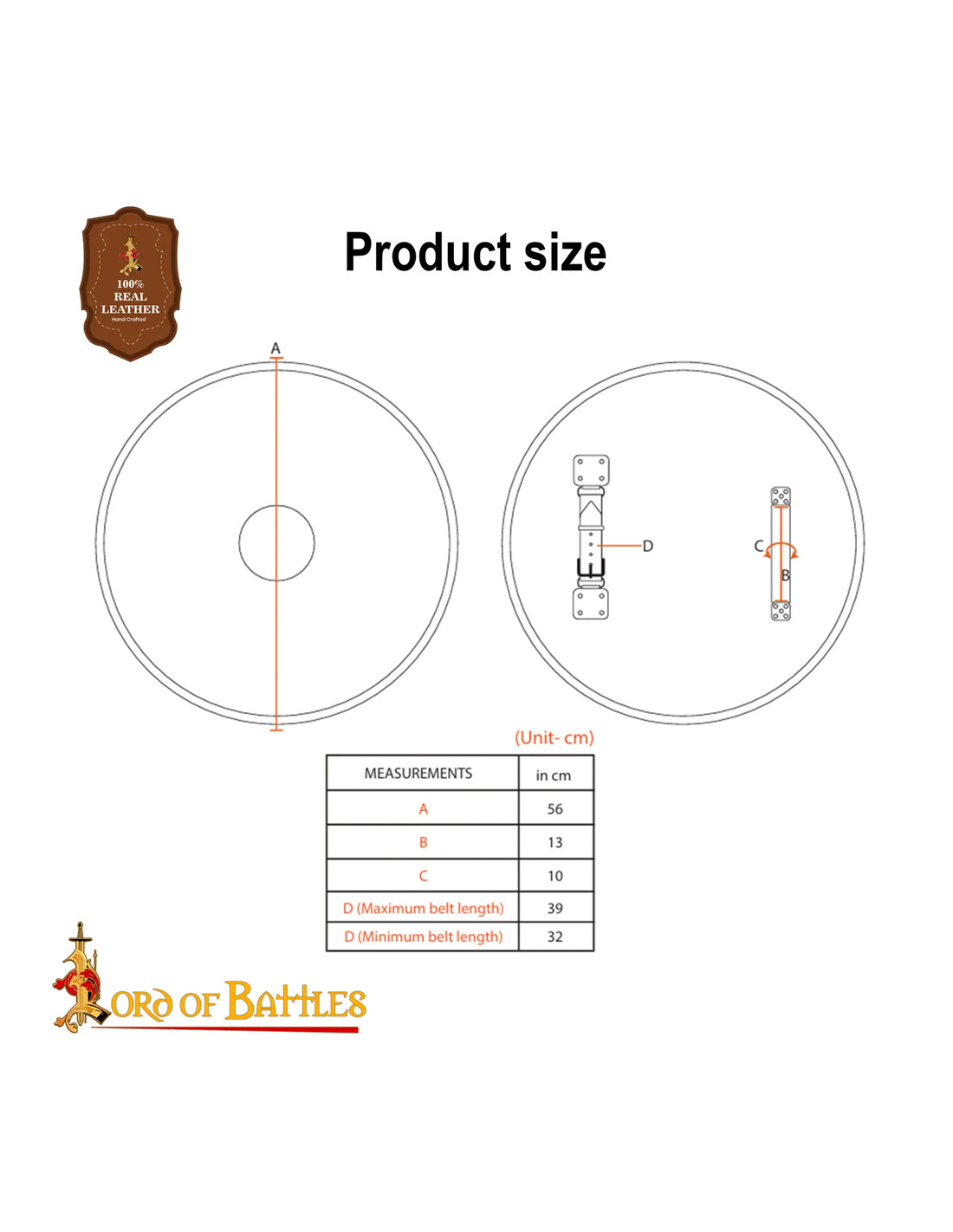 Darüber hinaus verfügt es über einen Lederriemen und einen verstärkten Metallgriff mit Holzüberzug für optimalen Halt. Die Metalldetails dieses Schildes bestehen aus 18-Gauge-Weichstahl, während der Umbo aus 16-Gauge-Weichstahl gefertigt ist, was eine hohe Festigkeit und Schutz gewährleistet.