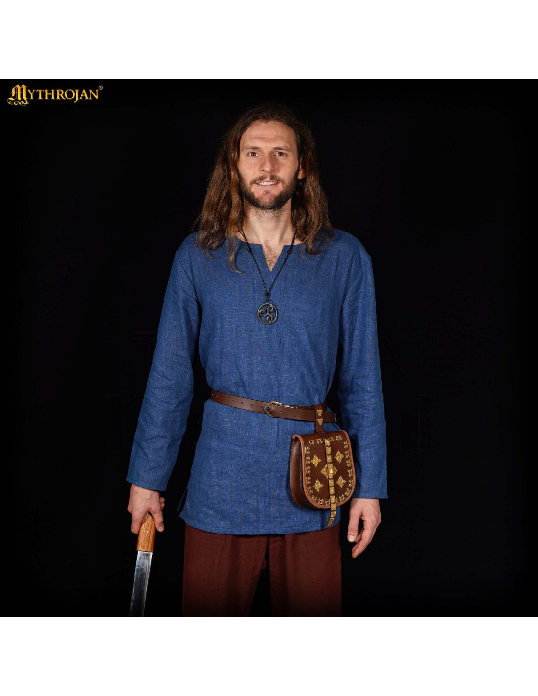 Basierend auf historischen Quellen ist diese kurze Leinentunika perfekt für alle, die eine bequeme Länge bevorzugen, ohne auf einen traditionellen Stil zu verzichten. Die leichte, natürliche Textur des Leinens, kombiniert mit seiner soliden blauen Farbe, verleiht eine elegante und schlichte Präsenz. Das Bild zeigt einen Mann in einem Stil, der an mittelalterliche oder fantasievolle Zeiten erinnert, mit einer knopflosen Hemd mit V-Ausschnitt, ergänzt durch Lederaccessoires und einen runden Anhänger, die deinem Look einen authentischen Touch verleihen.