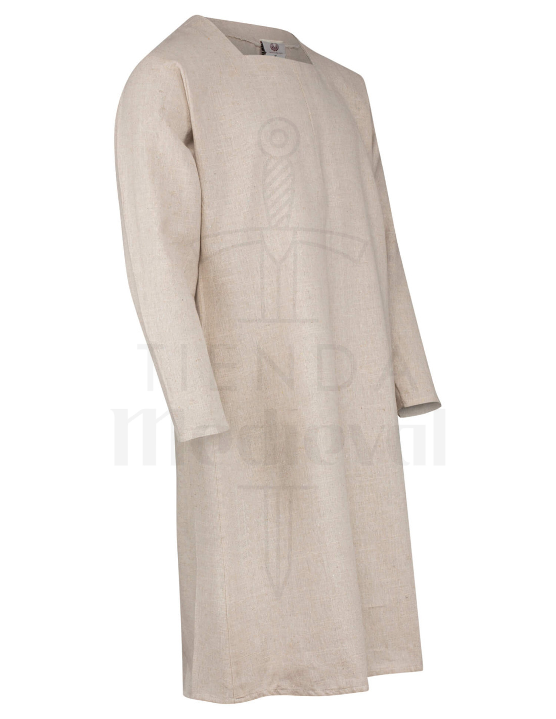 Hergestellt aus einer modernen Mischung aus leichtem Leinen ist diese Tunika atmungsaktiv und frisch, perfekt für den Sommer, ohne ihren rustikalen und eleganten Charakter zu verlieren. Der hellbeige Farbton verleiht eine natürliche und authentische Atmosphäre, die die Textilien der Epoche nachahmt, während ihr schlichtes und unkompliziertes Design auch bei historischen Veranstaltungen oder kulturellen Nachstellungen getragen werden kann.