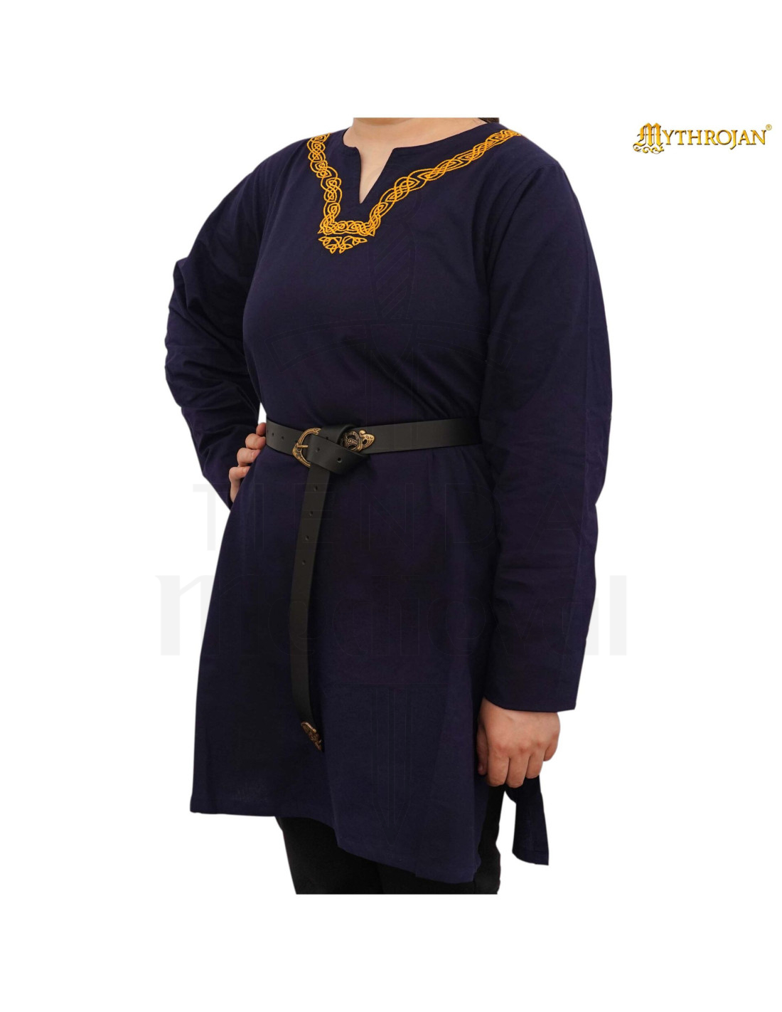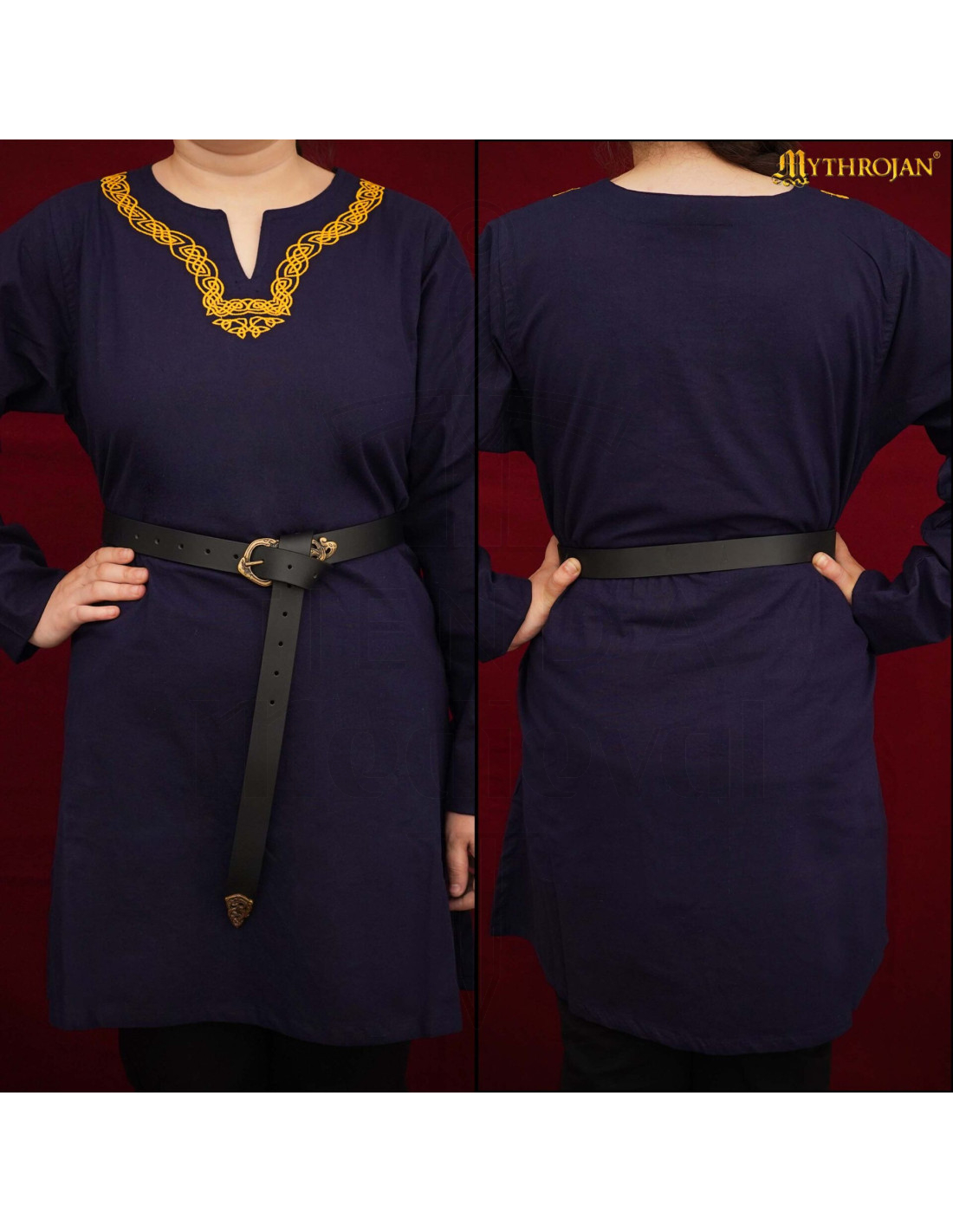 Mit seiner Vielzahl an Größen passt dieses Kleidungsstück zu verschiedenen Stilen und Bedürfnissen und ist vielseitig kombinierbar mit Ledergürteln, mittelalterlichen Hosen oder robusten Stiefeln. Das visuelle Produktbild zeigt ein marineblaues Kleid mit V-Ausschnitt, schwarzem Gürtel und gelber Stickerei, was seine handwerkliche Qualität und authentische Gestaltung für eine präzise Nachstellung der Wikinger-Ära widerspiegelt.