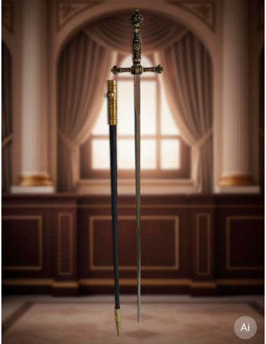 Entdecken Sie das zeremonielle Schwert mit Scheide, ein authentisches mittelalterliches Juwel, das in Ihrer Sammlung nicht fehlen darf. Sein imposantes und elegantes Design wird Sie in vergangene Epochen entführen, während seine Qualität und sorgfältig ausgearbeiteten Details Ihnen ein einzigartiges Stück garantieren.