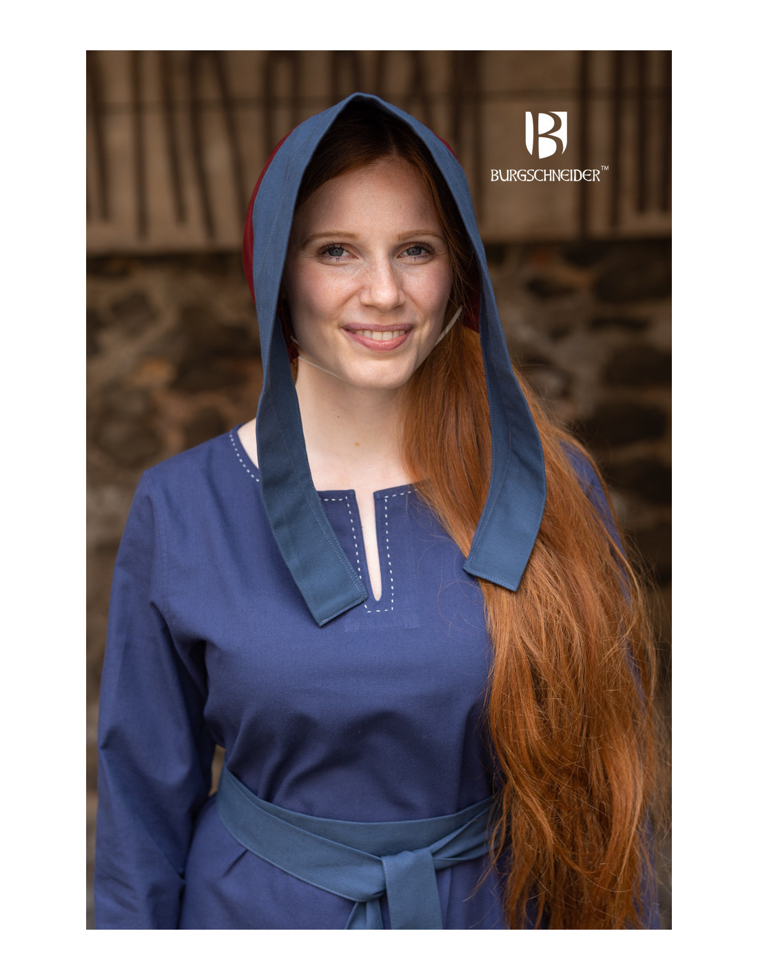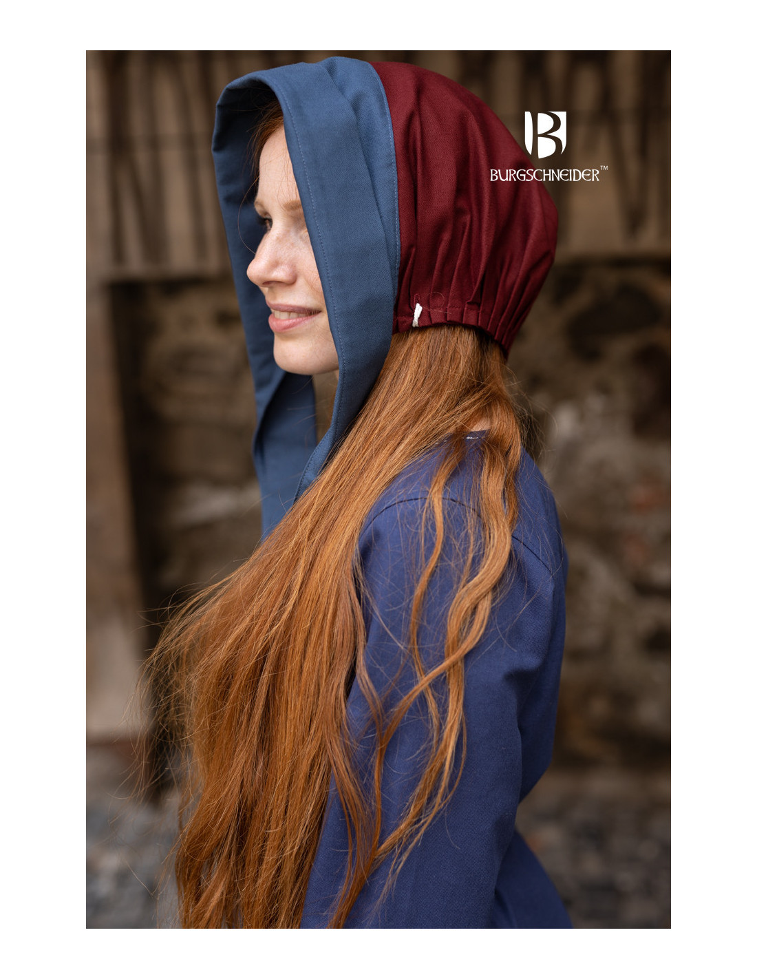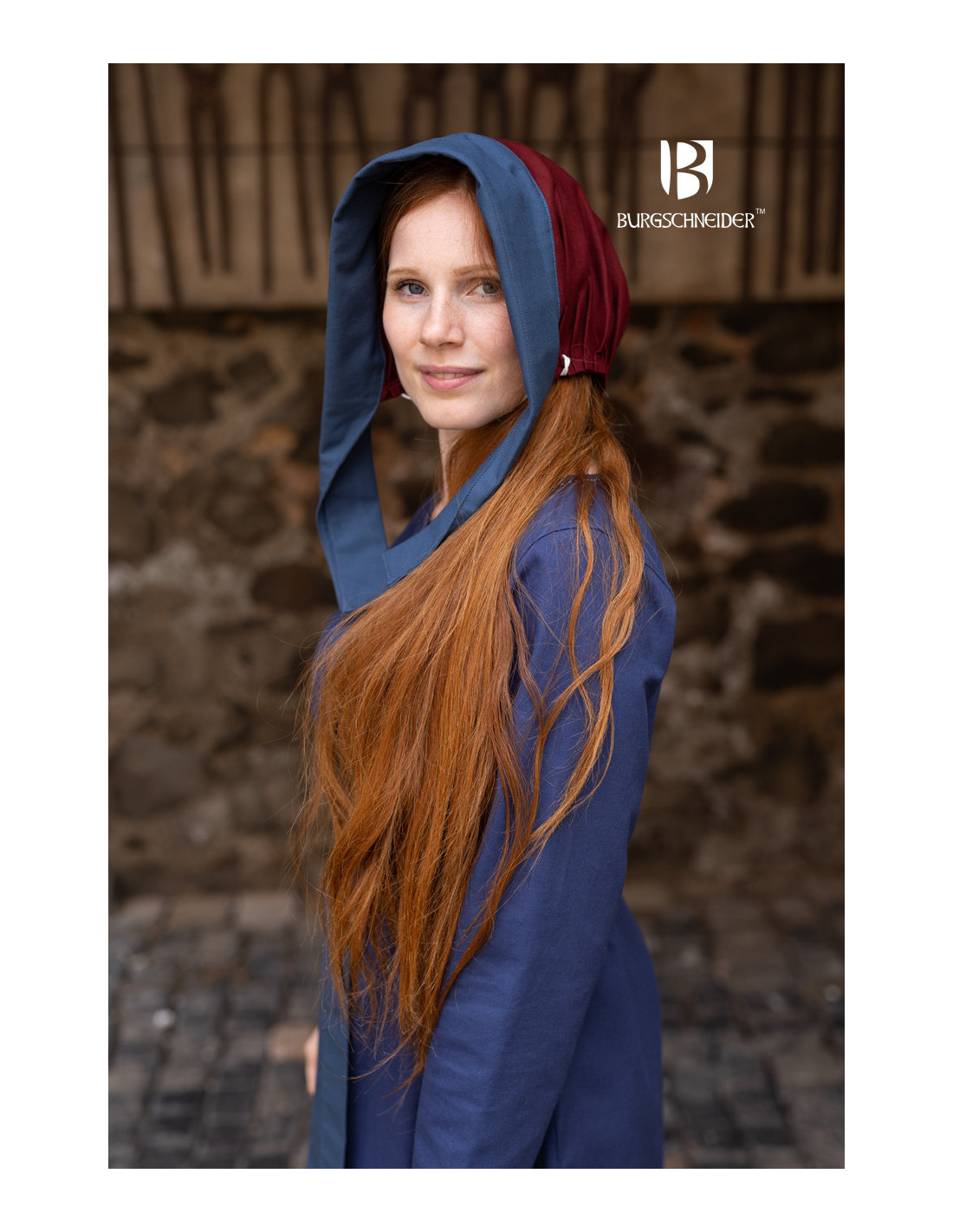 Mittelalterliche Damen-Mütze von Dagmar in den Farben Burgund und Blau. Diese Mütze besteht aus 100 % Baumwolle und ist daher weich und angenehm zu tragen. Darüber hinaus verleiht ihm sein Bonnet-Design einen mittelalterlichen und eleganten Touch. Es handelt sich um eine Einheitsgröße, sodass es für verschiedene Kopfgrößen geeignet ist. Perfekt für mittelalterliche Nachstellungen, Festivals, Kongresse, Bühnenaufführungen, Filme und mehr. Mit dieser Mütze können Sie bei jedem Anlass authentisch aussehen und auffallen. Verpassen Sie nicht die Gelegenheit, dieses einzigartige Accessoire Ihrer Sammlung mittelalterlicher Kleidung hinzuzufügen!