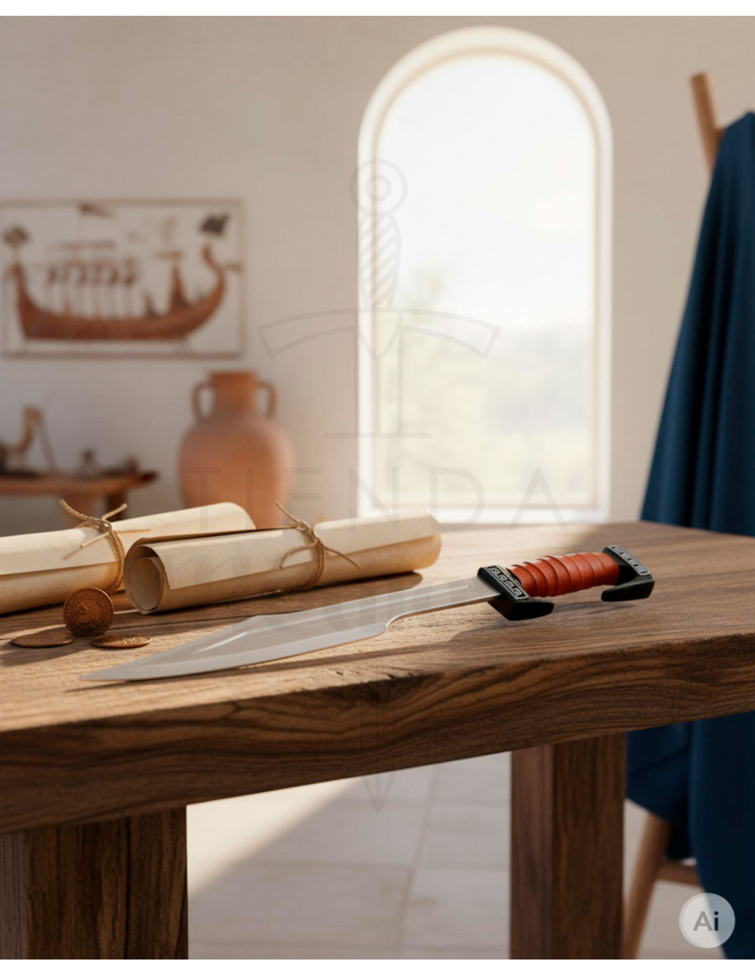 El abre-cartas espartano destaca por su hoja ancha y brillante, con un acabado detallado que refleja elegancia y fuerza. Su empuñadura trenzada en marrón asegura comodidad y firmeza, mientras que los protectores con motivos griegos añaden un toque distintivo. Con 18 cm de longitud, es perfecto tanto para abrir tus cartas con estilo como para exhibirse como pieza de colección.
