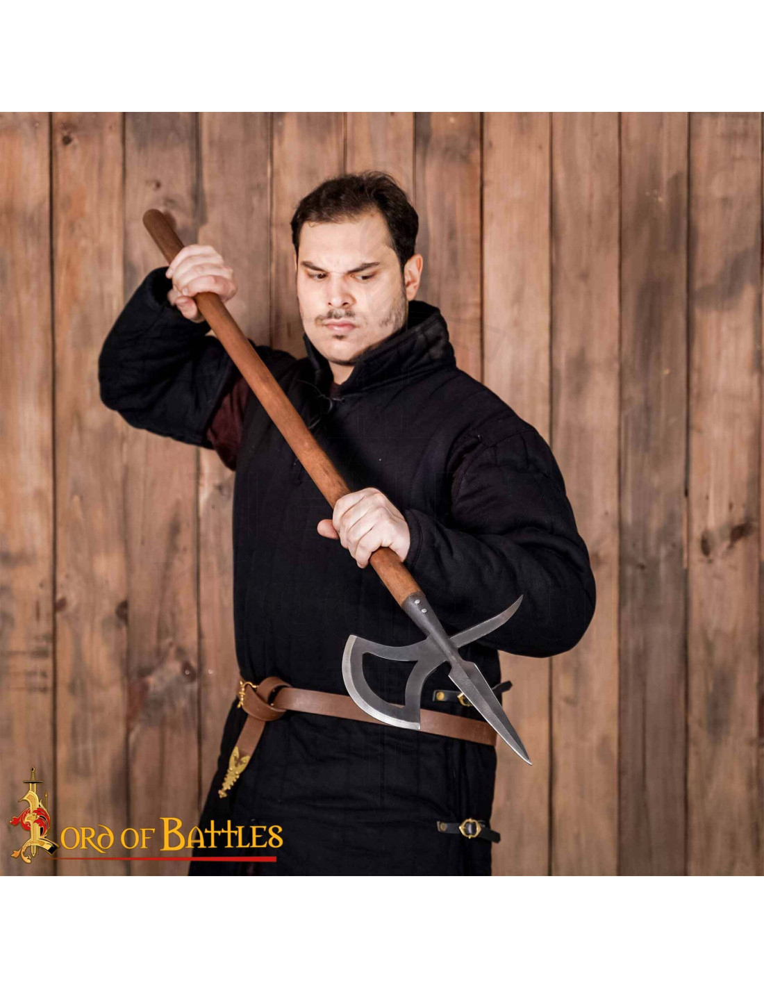 Esta pieza fusiona diseño funcional y estética ceremonial, ofreciendo una experiencia realista para recreaciones, teatro o exposiciones. La cabeza de acero al carbono, forjada a mano, no solo aporta un acabado fiel a las piezas de época, sino que también garantiza una sensación de uso que respeta la dinámica de las armas de asta originales, permitiendo movimientos fluidos y gestos escénicos con respuesta equilibrada.