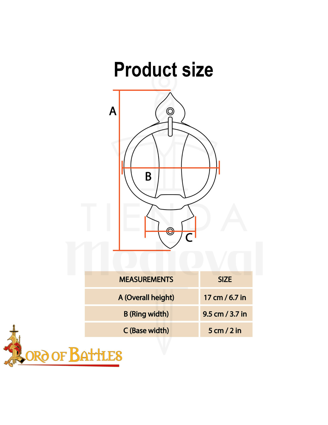 Imagina cómo resaltará en tu entrada, transmitiendo un carácter fuerte y distintivo desde el primer vistazo. Este tipo de aldaba, además de funcional, es una pieza decorativa que refleja autenticidad y estilo, perfecta para proyectos de diseño original o reconstrucciones de épocas pasadas. La marca 'Lord of Battles' en la parte inferior resalta su inspiración en la tradición medieval, perfecta para los apasionados de la historia y la artesanía. Dale a tu hogar un toque legendario con una pieza que combina historia, arte y durabilidad en cada detalle.