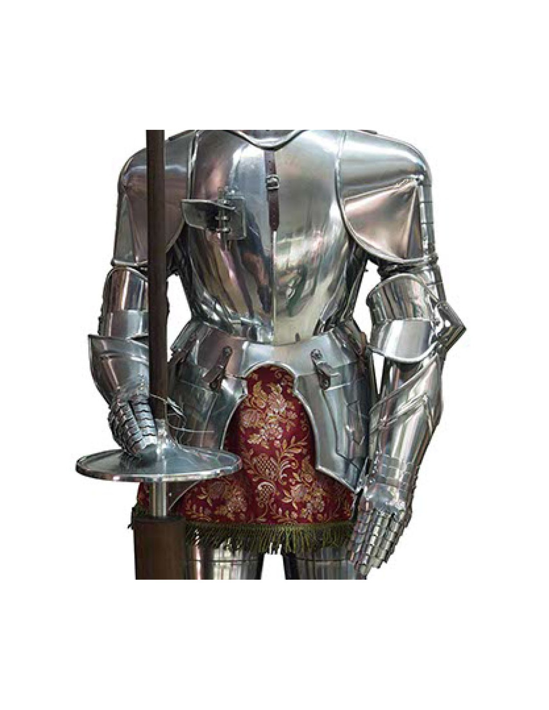 Esta magnífica pieza ha sido fabricada en Toledo, España, reconocida mundialmente por su tradición en la producción de armaduras y armas medievales. Su calidad artesanal y atención al detalle hacen de esta armadura una auténtica obra de arte.