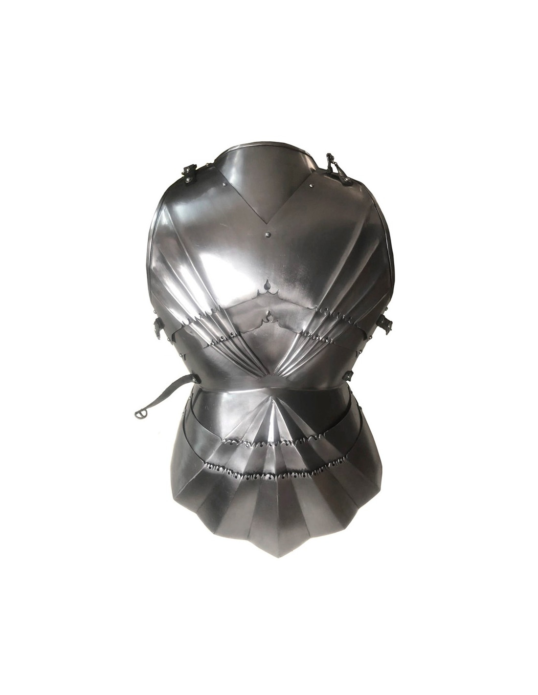 Inspirada en las armaduras utilizadas durante los siglos XV y XVI, esta pieza es una auténtica obra de arte. Aunque no está preparada para ser utilizada en batalla, su fabricación en acero de 1,2 mm de grosor con piezas remachadas la convierte en una coraza funcional y resistente.