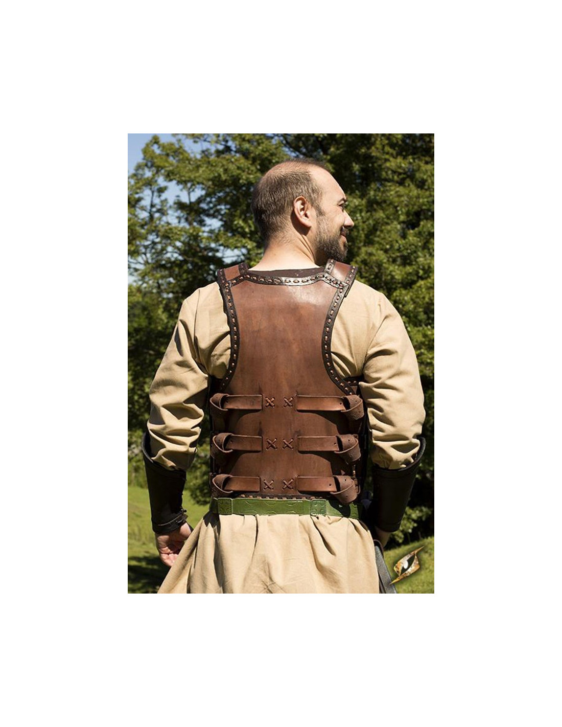 Para garantizar un ajuste perfecto, esta sólida coraza cuenta con tres largas correas de cuero y hebillas de latón en los costados, que permiten sujetar la parte delantera a la placa posterior. De esta manera, podrás ajustarla a tu medida y sentirte cómodo y seguro durante tus combates.
