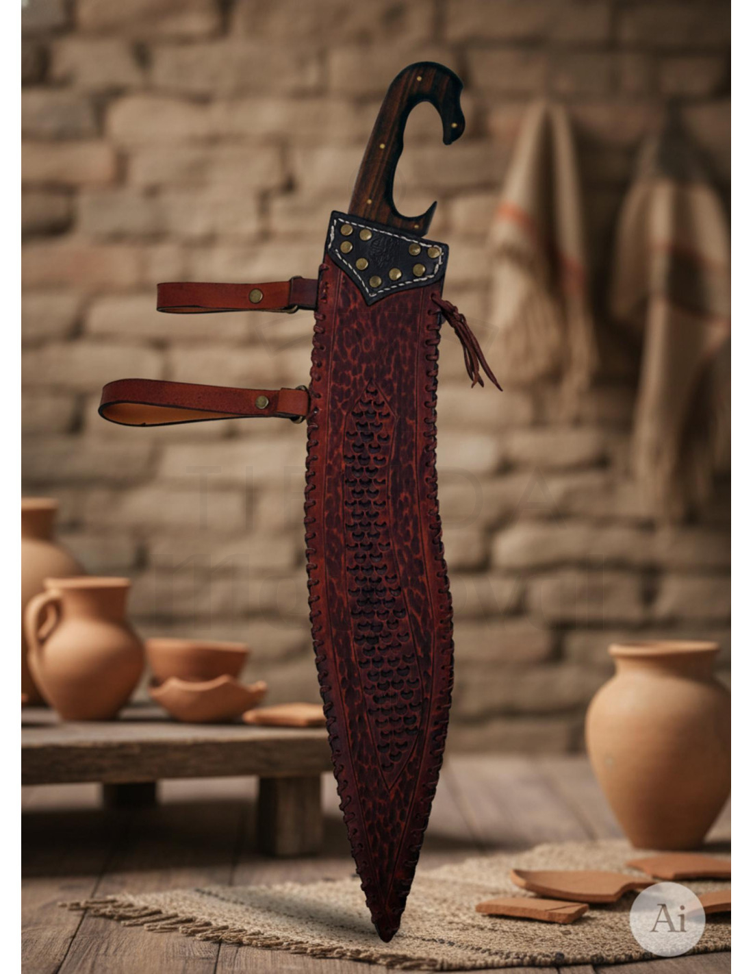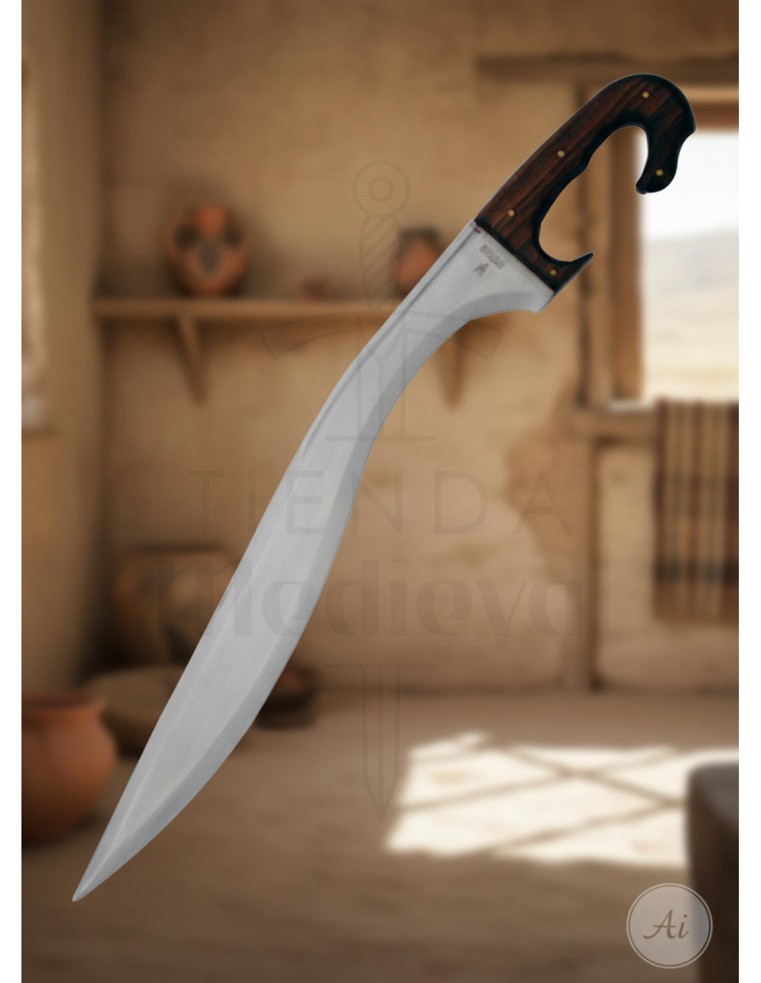 Espada falcata íbera funcional fabricada en Toledo, España. Se trata de una espada lista para el combate y elaborada en Toledo por el maestro armero JL Rubio, una de las pocas fábricas que tiene el sello de 'Hecho en Toledo'. La hoja es forjada en acero al carbono y templada a mano. Incluye vaina repujada en cuero lista para colgar en el cinturón. La empuñadura es de madera remachada.
