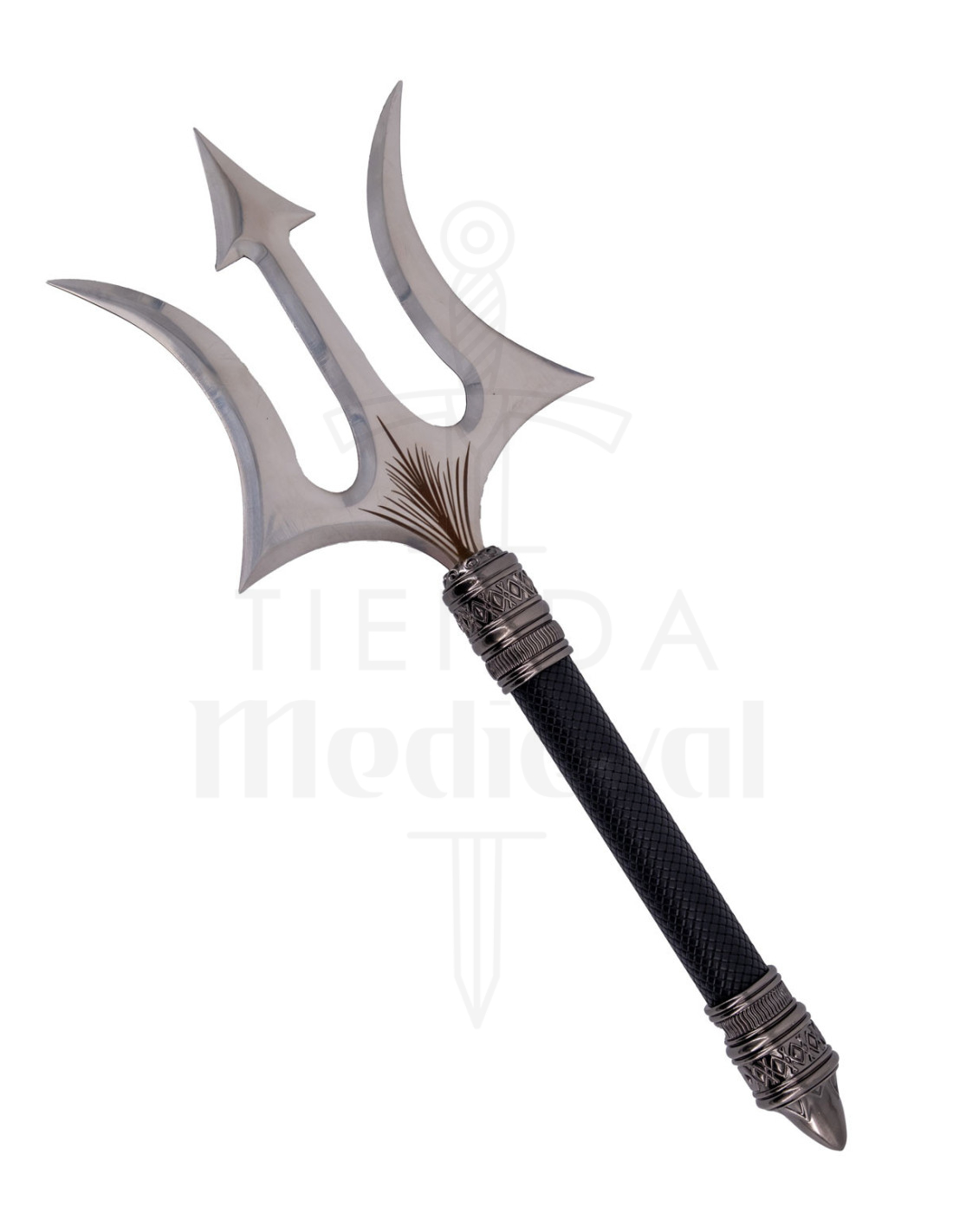 El Tridente ceremonial corto con empuñadura encordada combina un aspecto metálico pulido con un mango pensado para sentirse firme en la mano, ofreciendo una presencia imponente sin renunciar a la comodidad. Su punta central, rematada en forma de flecha, junto a las dos puntas laterales curvadas, crea una silueta distintiva que destaca en cualquier vitrina o rincón temático.