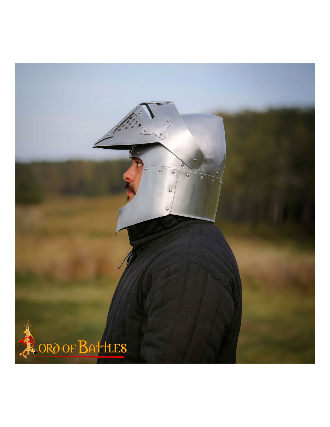 - Diseño Versátil con Visera Abatible: Inspirado en manuscritos históricos, este casco cuenta con una visera abatible que añade versatilidad al caballero. La posibilidad de refrescarse o beber sin quitarse el casco es un detalle que marca la diferencia en la batalla.