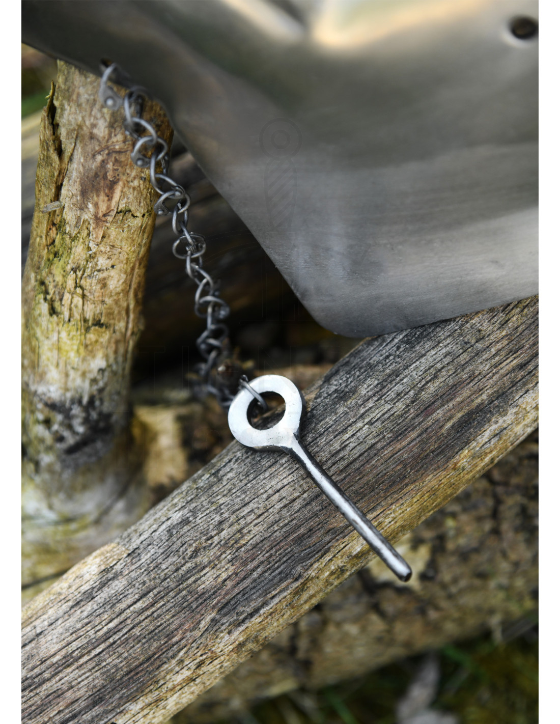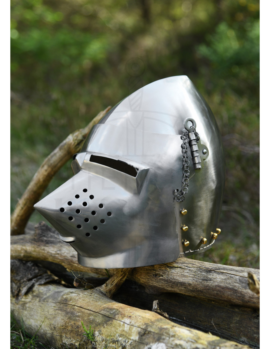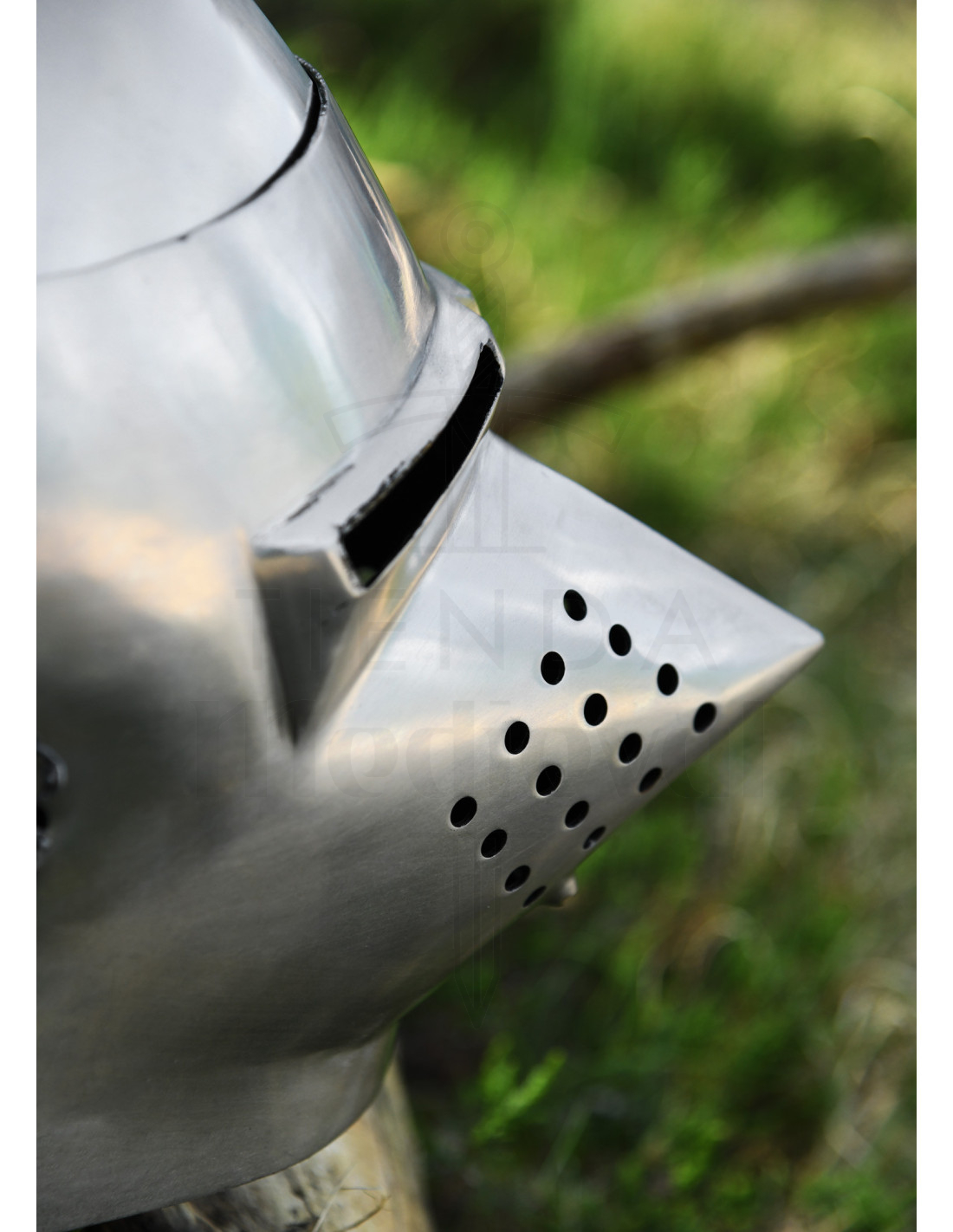 Inspirado en un modelo de Milán del siglo XIV, su diseño no es sólo estético, sino pensado para maximizar la defensa y la ventilación. El distintivo hocico sobresaliente no solo protege el rostro de golpes directos, sino que también permite una mejor circulación de aire, manteniéndote fresco en situaciones intensas. Además, su visor removible con bisagra facilita una fácil gestión durante la batalla o el descanso, asegurando comodidad y seguridad sin sacrificar el estilo.