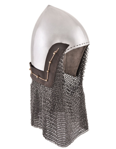 Pero lo que realmente hace especial a este bacinete es su verdugo de anillos planos. Este accesorio, sujeto mediante pasadores de ojal y un cordón de cuero, brinda una excelente protección para tu cuello, manteniéndolo a salvo de los golpes y cortes del enemigo. Ahora, podrás enfrentarte a tus adversarios con confianza y seguridad.