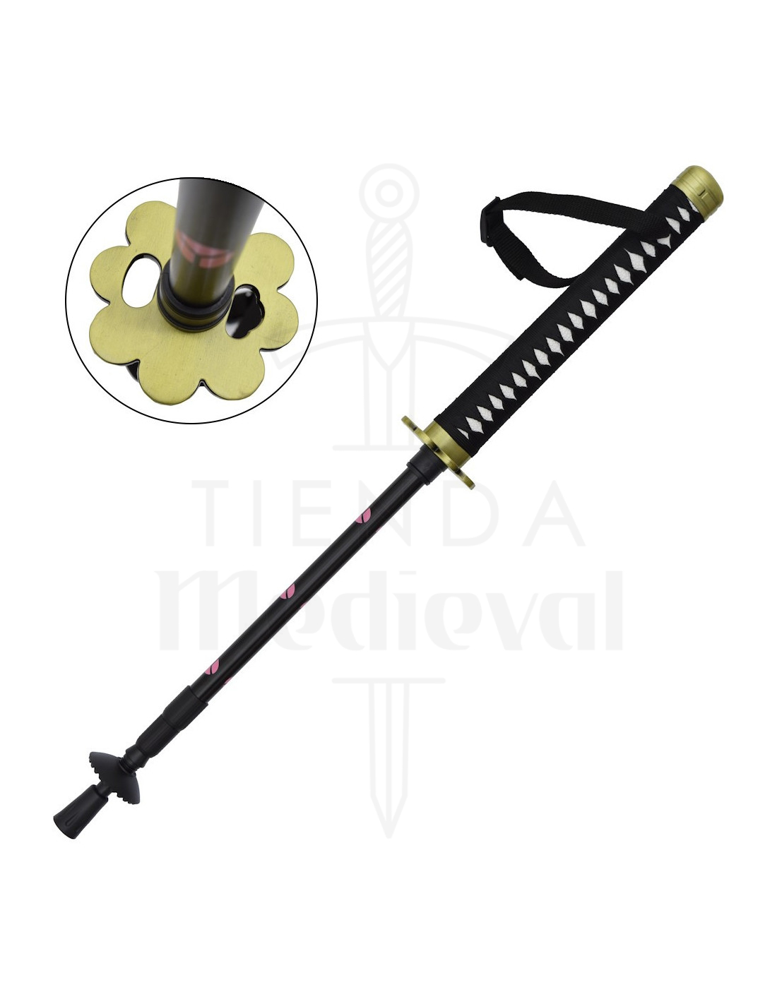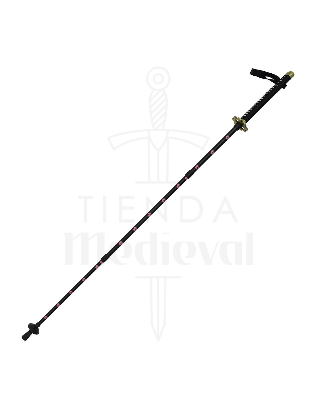 Decorado con detalles en rosa que evocan el estilo del guerrero Roronoa Zoro, uno de los personajes más populares en el universo de 'One Piece', este bastón combina la pasión por el anime con la practicidad del equipo de senderismo. Su acabado en negro le confiere un aspecto elegante y moderno, mientras que la punta metálica proporciona un excelente agarre sobre diferentes superficies.