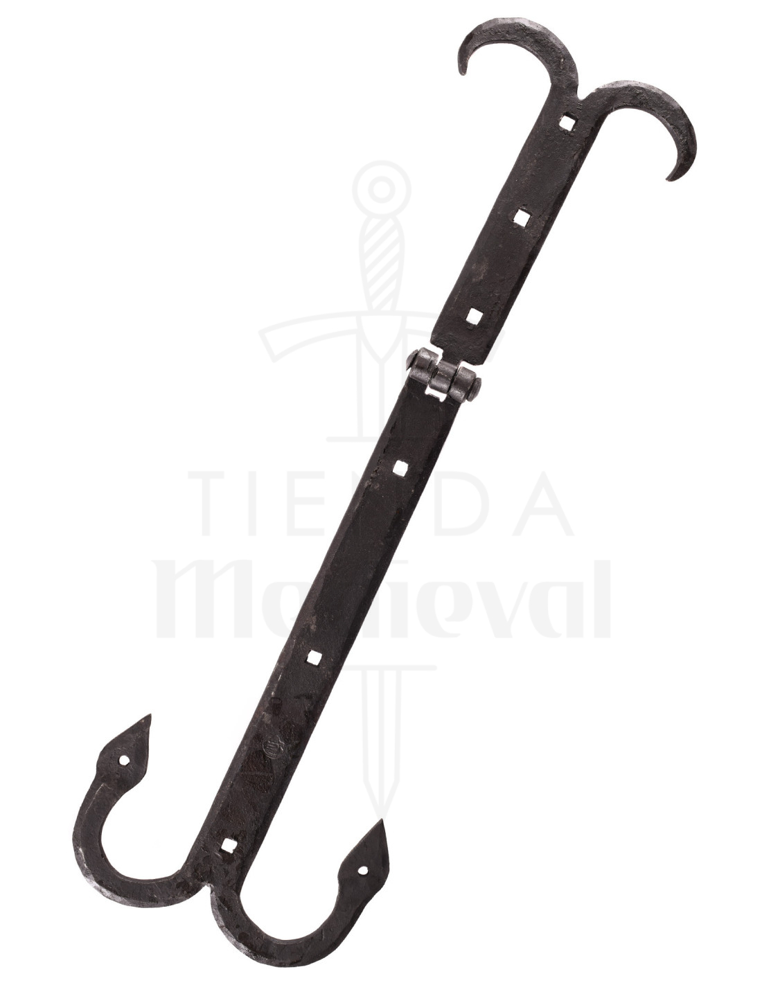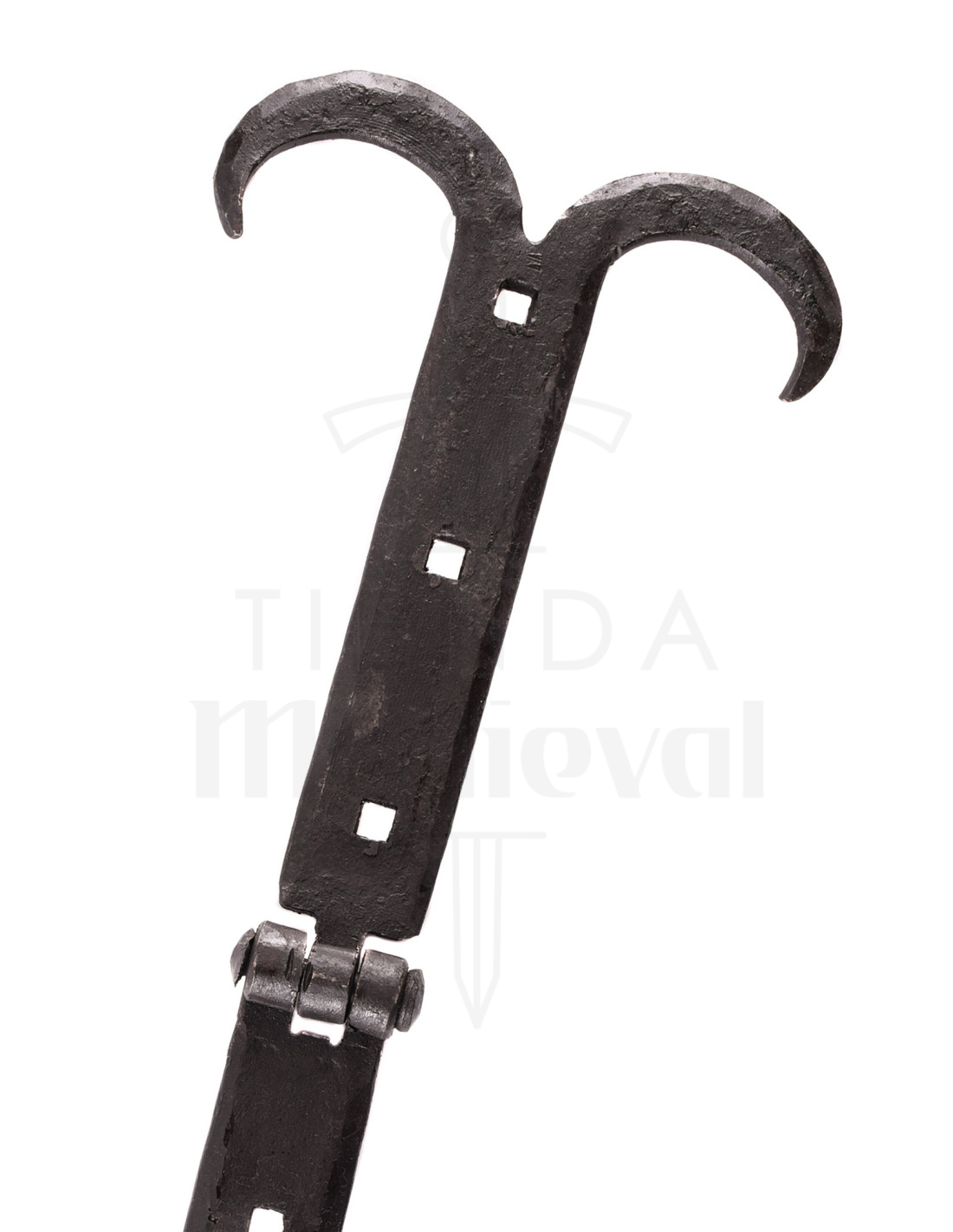 Su acero forjado, trabajado con esmero según ejemplos medievales, garantiza una resistencia y durabilidad que solo el arte tradicional puede brindar. La forma de sus extremos, cuidadosamente elaborados y divididos, añade un detalle visual distintivo que realza su aspecto rústico y artesanal.