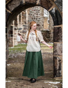 La blusa Amelia presenta un corte sencillo y clásico con mangas hasta el codo y puños con cordones. El escote y los puños cuentan con cintas de raso negro para un toque de elegancia. Además, la blusa tiene dos aberturas a los lados para mayor comodidad de uso y cordones de ajuste en el escote para un ajuste personalizado. Esta blusa puede llevarse con o sin hombros, lo que la hace muy versátil y fácil de combinar con cualquier falda medieval o pantalón. Además, la blusa Amelia se puede lavar en la lavadora a un máximo de 30°, pero se recomienda lavar en el ciclo delicado para mantener el color y la calidad del tejido.