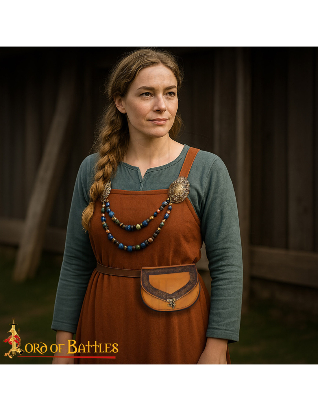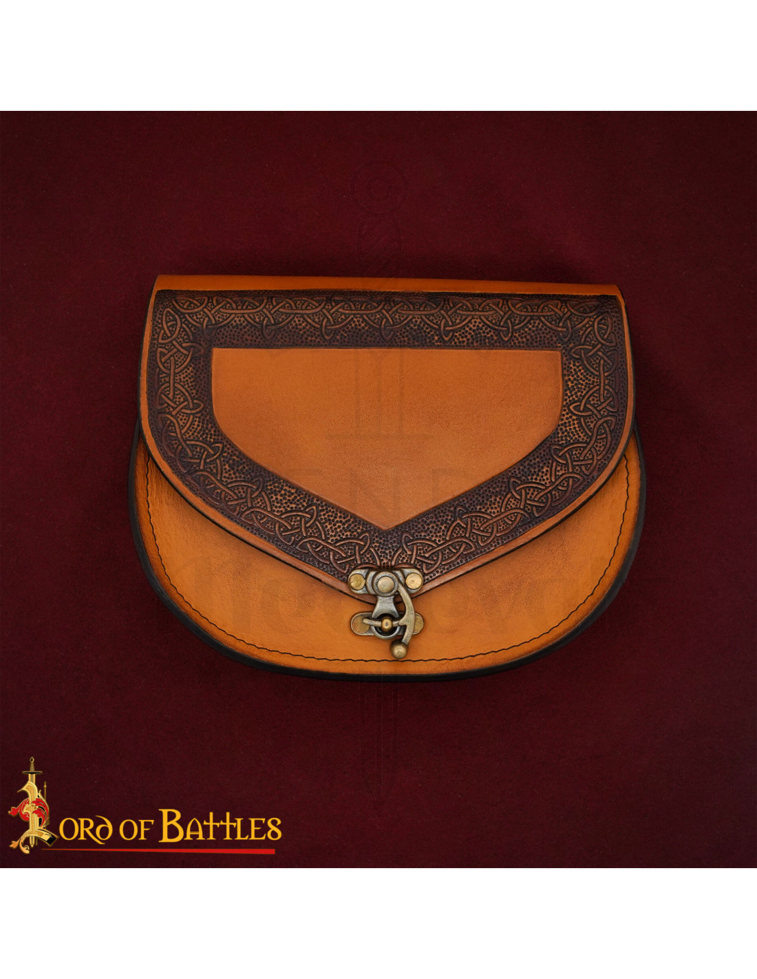 Este bolso combina la calidez del cuero genuino con un repujado celta que no pasa desapercibido, y te ofrece una pieza práctica que realza cualquier atuendo, desde tu kit histórico hasta tu look urbano. El cierre metálico en tono latón mantiene tus objetos seguros, mientras la forma semicircular y el acabado artesanal permiten acceder rápido a monedas, llaves, tarjetas o herramientas pequeñas, sin perder elegancia.