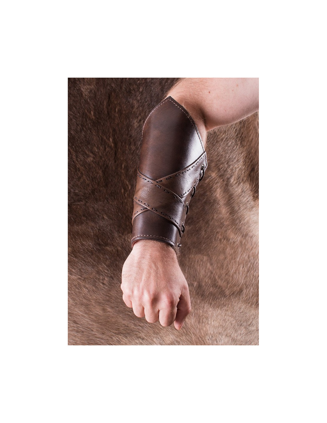 Además de su funcionalidad, estos impresionantes brazaletes cuentan con un diseño estético que evoca la atmósfera medieval. Su frente está adornado y reforzado con dos bandas de cuero que forman un elegante motivo cruzado, destacando tu estilo único y añadiendo un toque de autenticidad a tu apariencia. Las costuras resistentes aseguran una durabilidad duradera, de modo que podrás confiar en la calidad de estos brazaletes incluso en los combates más intensos.