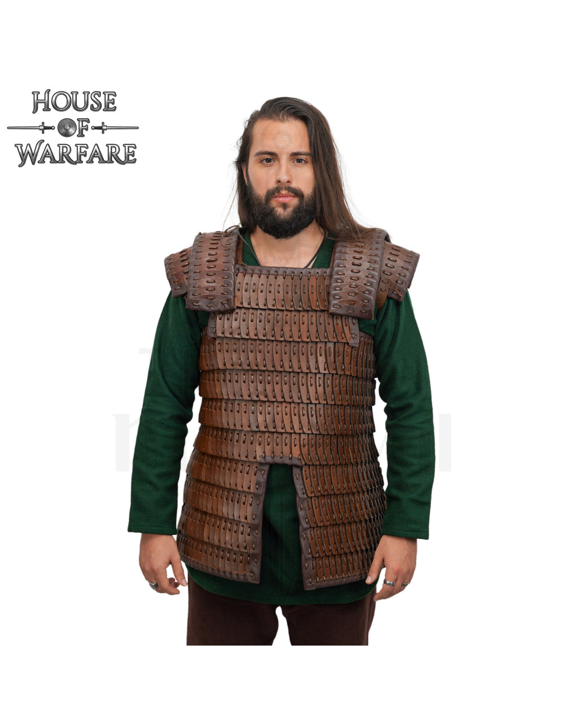 El diseño lamelar, con tiras rectangulares unidas por cordones visibles, no solo aporta autenticidad, sino también una sensación de robustez visual que funciona igual de bien en una batalla escénica que en una exhibición. Visualmente destaca sobre prendas como una camisa de manga larga en tonos oscuros, creando un contraste histórico y elegante que llama la atención.