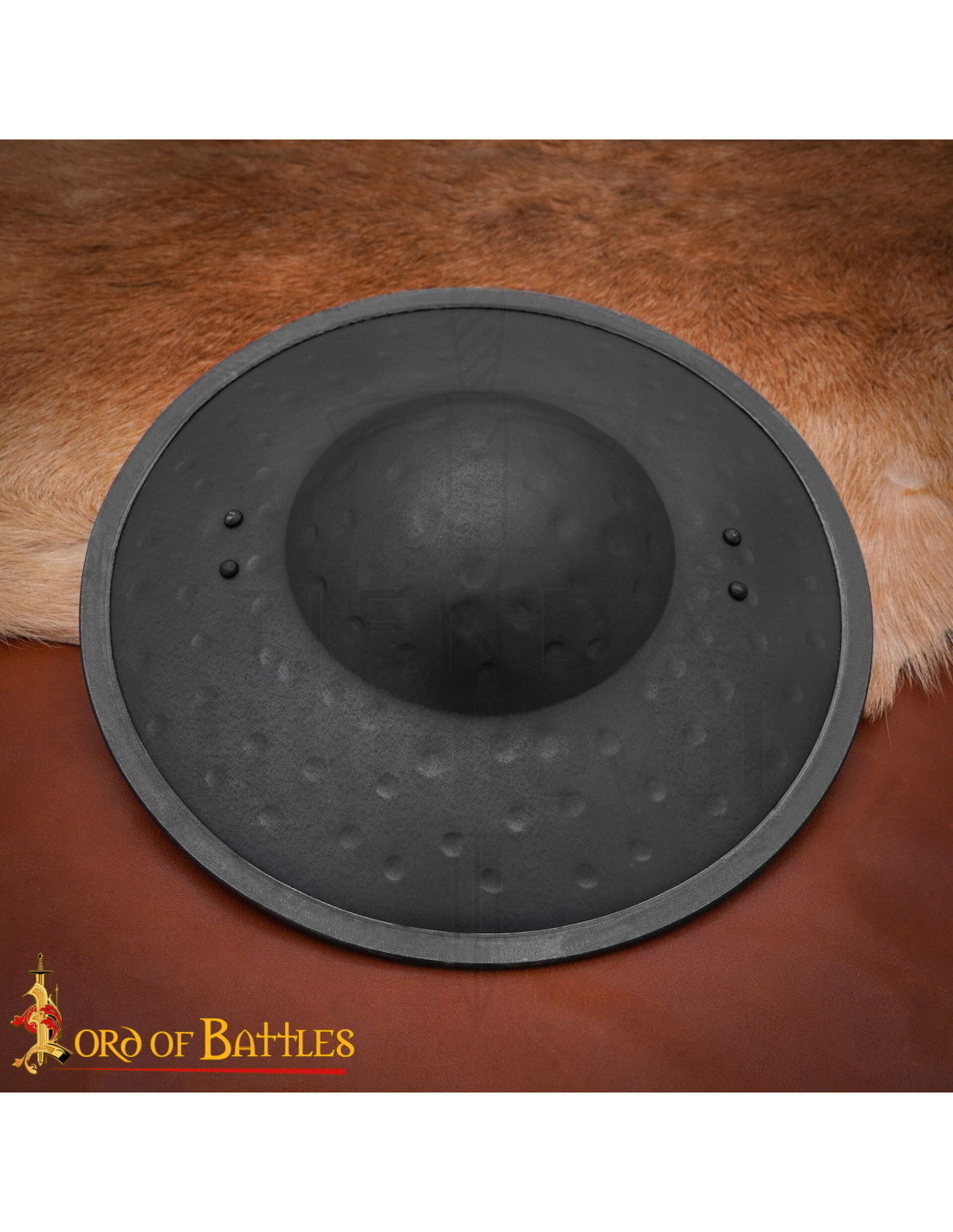Forjado a mano en acero, su superficie martillada crea un acabado mate y áspero que evita reflejos molestos y añade carácter a cada bloqueo o parry, mientras que las pequeñas depresiones repartidas uniformemente aportan textura y una apariencia auténtica que destaca en cualquier puesta en escena o vitrina. El color ennegrecido refuerza ese aire sobrio y guerrero, perfecto para recreaciones medievales o atuendos de fantasía.