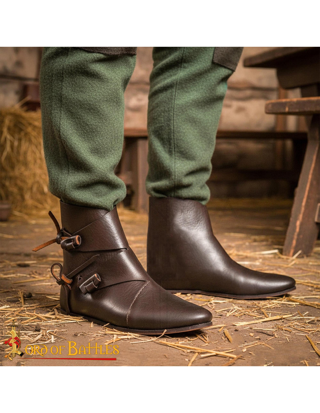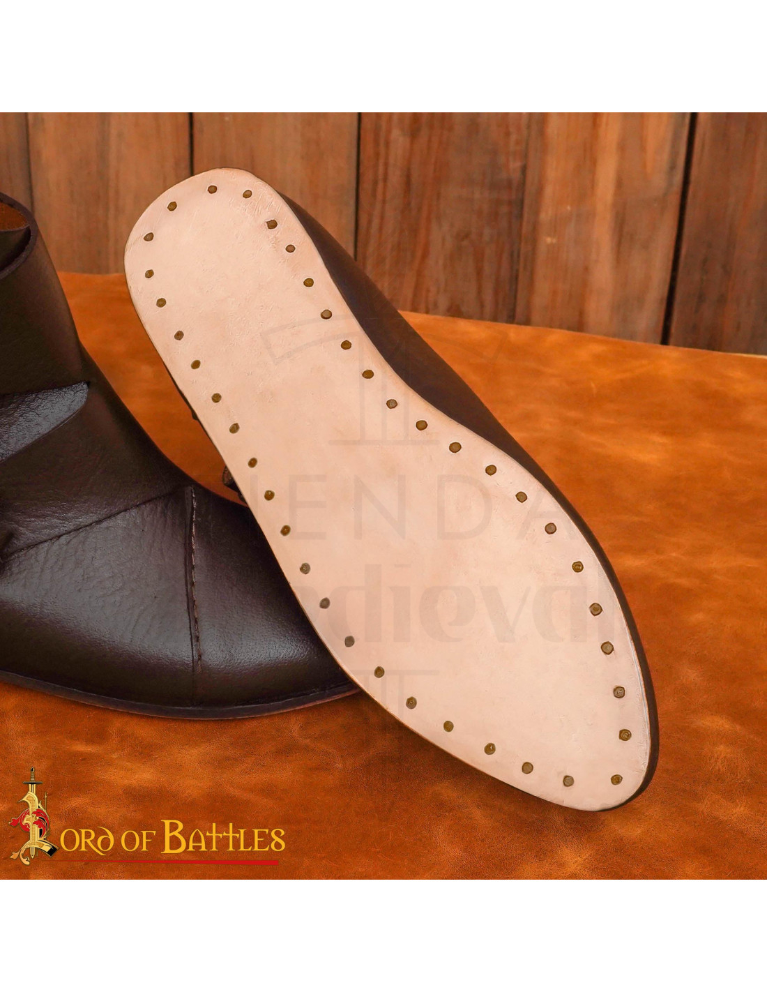 Su caña baja hasta el tobillo y la punta ligeramente afinada permiten libertad de movimiento, ideal para desplazamientos ágiles sin renunciar a la apariencia histórica. El interior en tono claro y el acabado sin artificios transmiten autenticidad visual, mientras que la suela de cuero plano aporta esa sensación de contacto natural con el terreno, perfecta para senderos de tierra, bosques y ambientes de feria medieval.