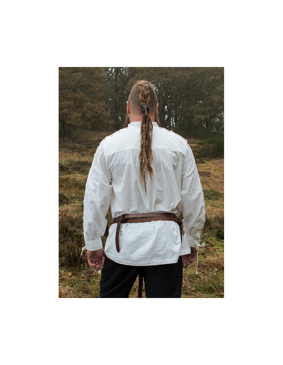 La camisa medieval blanca con lazos modelo Corvin es una prenda imprescindible para todos los visitantes del mercado medieval. Su corte ancho y su diseño único la convierten en un verdadero tesoro para aquellos que buscan sumergirse en la época medieval.