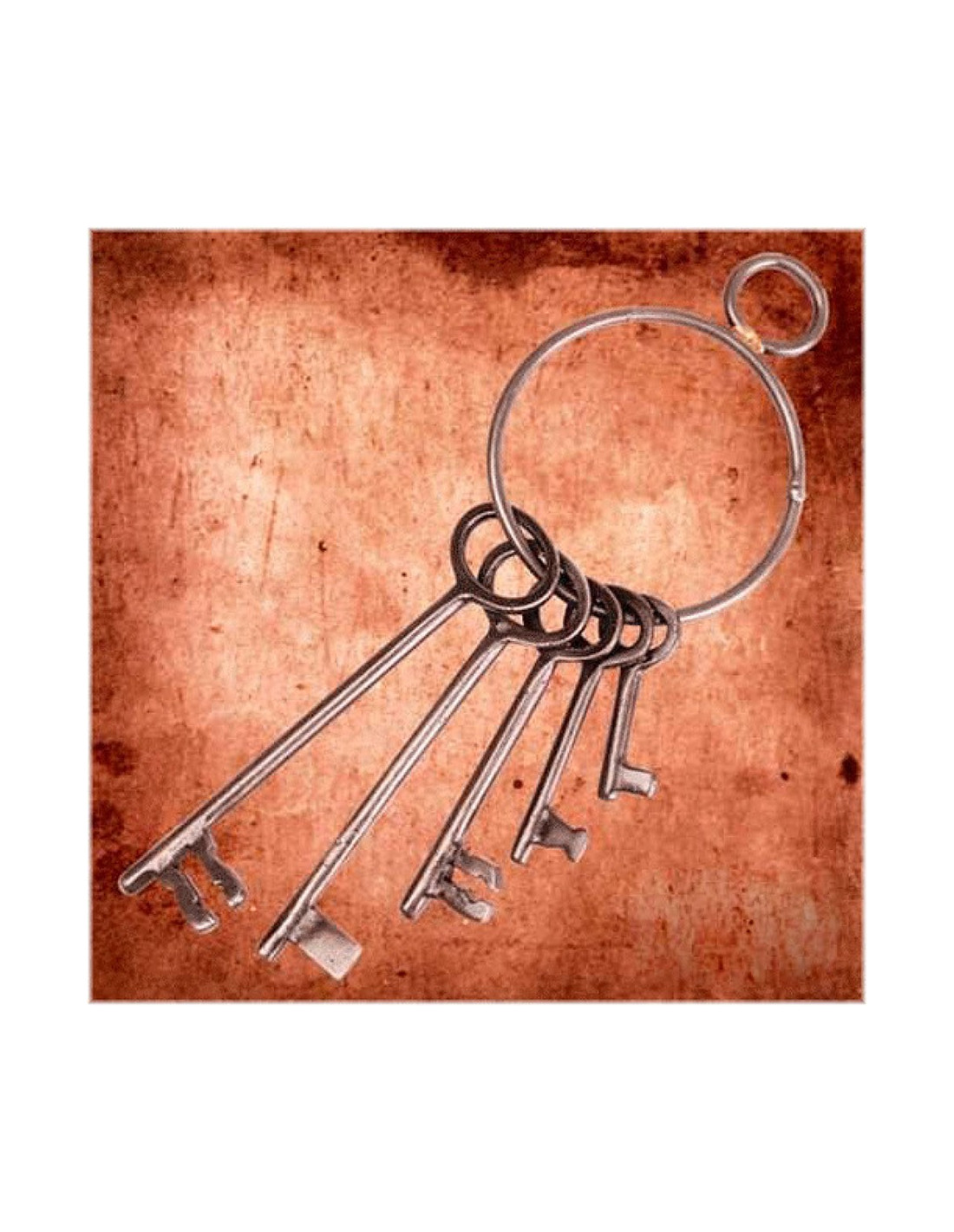 El único medio para escapar de la Torre de Londres o de la famosa Bastilla, sería robar las llaves del carcelero. Este gran conjunto de llaves antiguas ha sido forjado en metal como las originales y es un complemento imprescindible en muchas recreaciones.