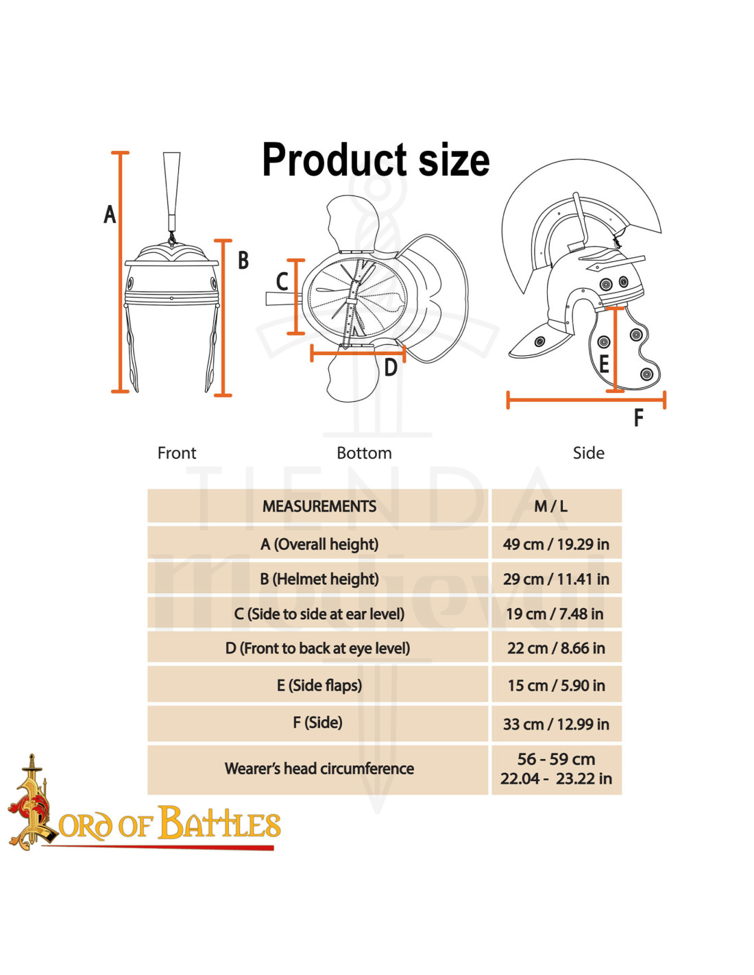 Este casco de batalla de época cuenta con protección articulada en las mejillas, permitiendo un ajuste cómodo y seguro sin restringir el movimiento. La gorra de cuero ajustable y la correa de barba aseguran un ajuste perfecto para largas horas de uso. La estructura robusta y decorativa, junto con los remaches y adornos en la parte frontal, reflejan su origen y protagonismo en la historia militar romana.