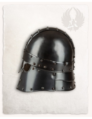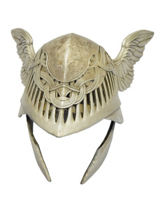 Las alas laterales, curvas y trabajadas como plumas, añaden dinamismo y elegancia, mientras que las ranuras frontales evocan una parrilla protectora que refuerza su aspecto heroico. La parte frontal superior luce patrones entrelazados finamente esculpidos, que aportan profundidad visual y una sensación de artesanía cuidada. La protección inferior, dividida en dos piezas móviles, sugiere movimiento y realismo, haciendo que la pieza parezca lista para una historia épica.