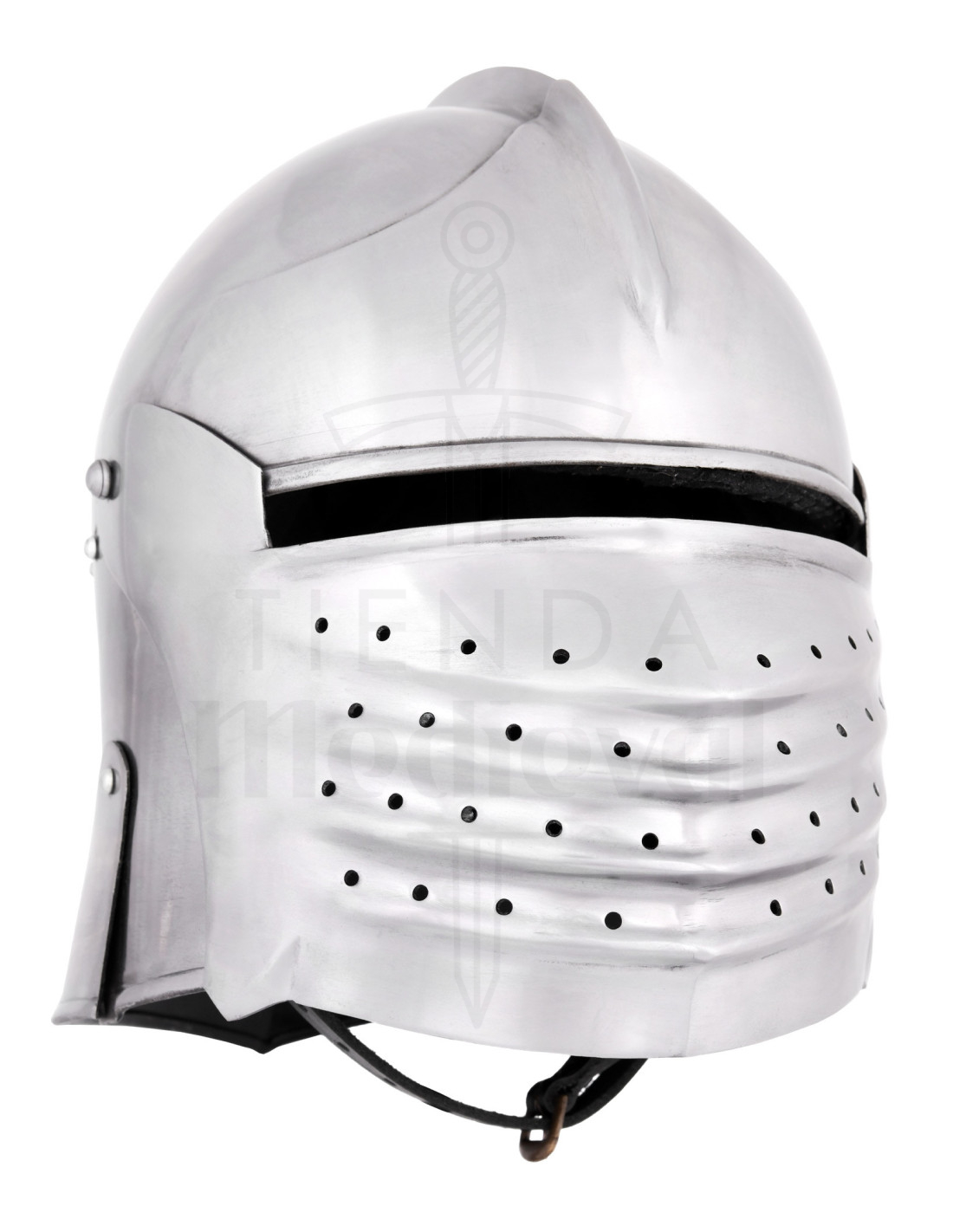 La protección nasal de 4 mm asegura que tu rostro esté completamente resguardado, al tiempo que el cierre de cuero con hebilla de latón asegura un ajuste perfecto en tu barbilla. Además, para tu comodidad, la celada cuenta con un acolchado interior que garantiza un ajuste cómodo y seguro.