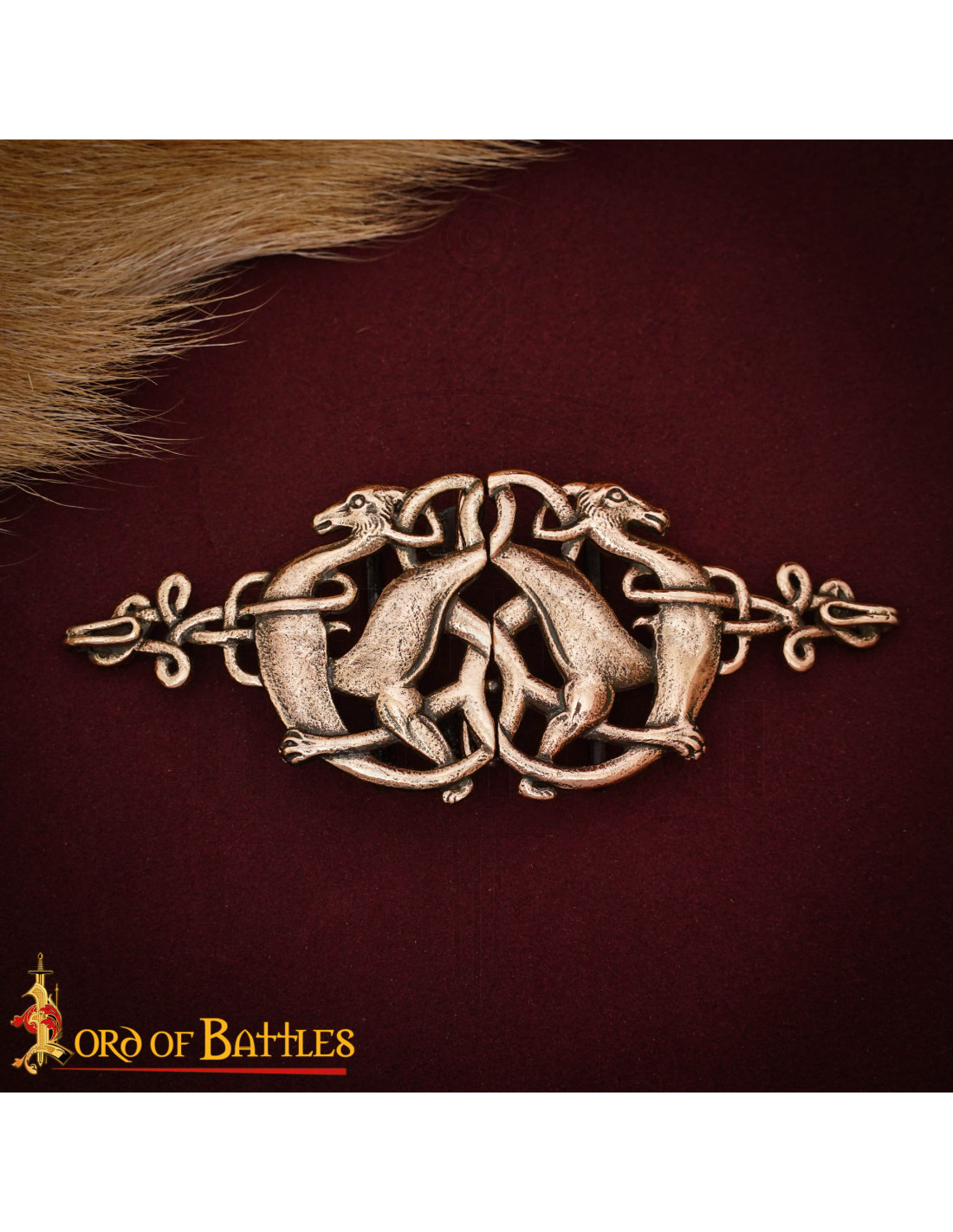 Con un motivo celta de ciervos entrelazados, las figuras enfrentadas y la trabajada trama de nudos transmiten movimiento y elegancia, mientras las líneas que simulan textura recuerdan la piel y el pelaje estilizado de antiguas piezas medievales. En la fotografía, el brillo apagado del bronce sobre una tela burdeos intensifica su presencia, haciendo que destaque incluso en escenas sobrias.