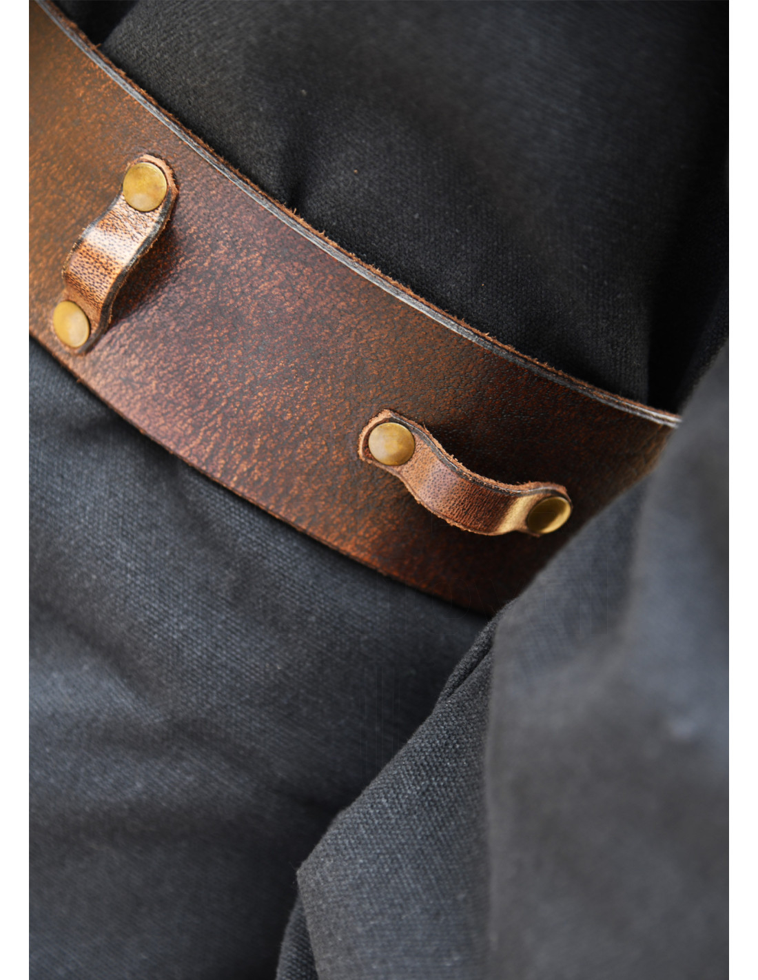 Confeccionado con cuero de búfalo tratado de manera natural, su acabado pulido y el tono ligeramente desgastado aportan un encanto genuino que realza cualquier atuendo, desde un look casual hasta combinaciones más elaboradas inspiradas en la época medieval.