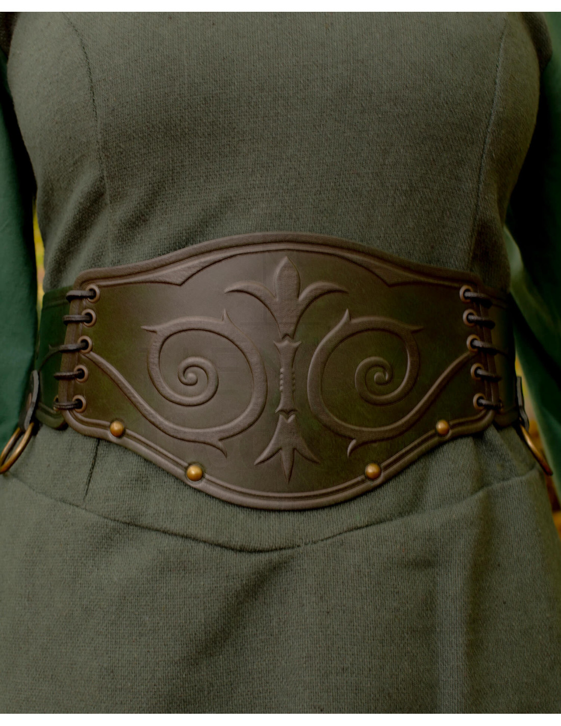 Este cinturón ancho en piel muestra en su frontal un motivo tallado de espirales y formas estilizadas, pensado para realzar la silueta sin renunciar a la funcionalidad. El acabado liso y pulido del cuero aporta un aspecto artesanal y resistente, perfecto para quien busca una presencia cuidada y con carácter en recreaciones o en ocasiones especiales.