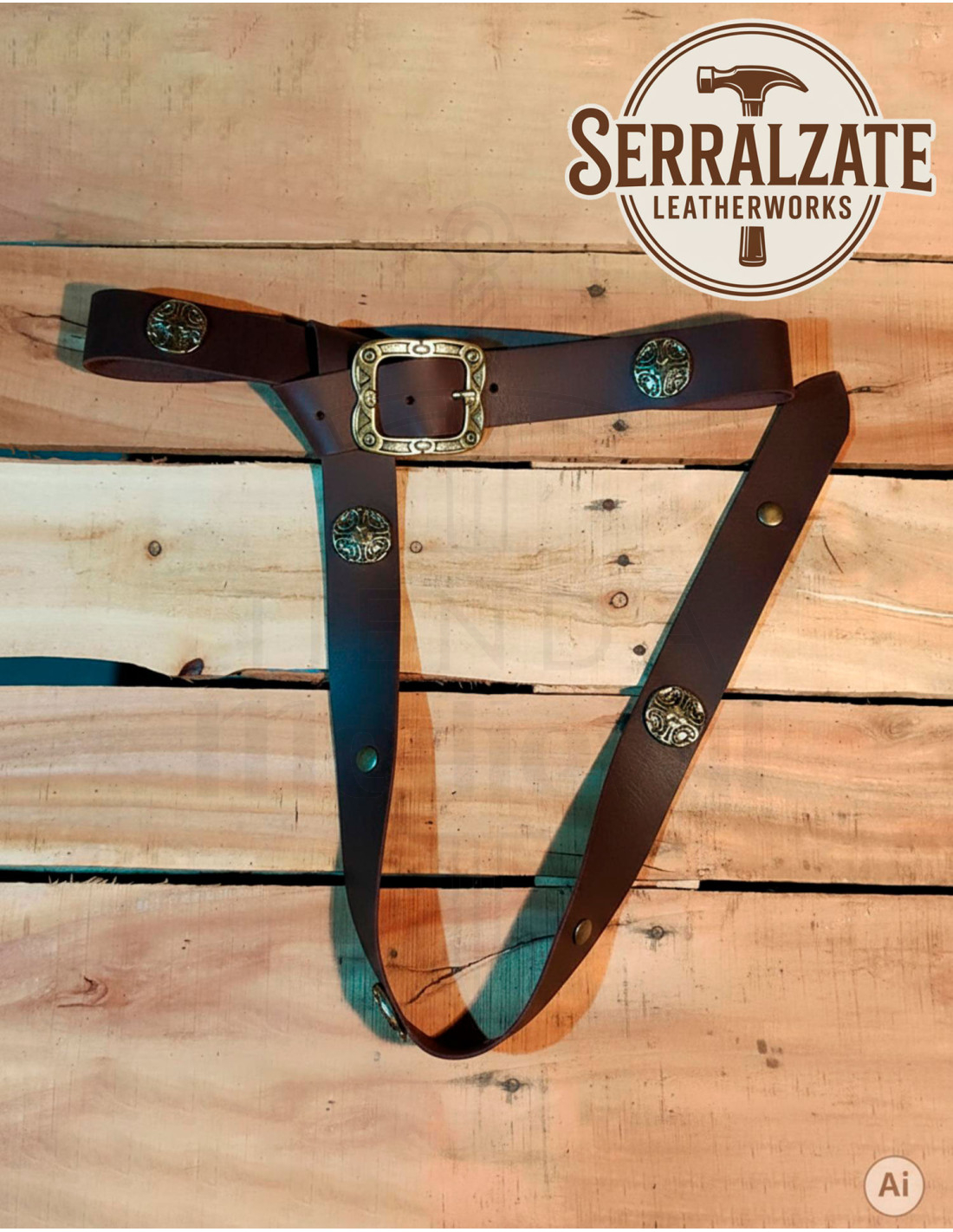 Los remaches dorados y los apliques circulares con relieves de inspiración celta aportan un aire de nobleza, mientras que la hebilla labrada, concebida como pieza de autor, actúa como punto focal del conjunto, realzando cualquier look con un toque artesanal. Ese contraste entre metal y cuero recuerda a piezas forjadas con intención, perfectas para quien aprecia el detalle.