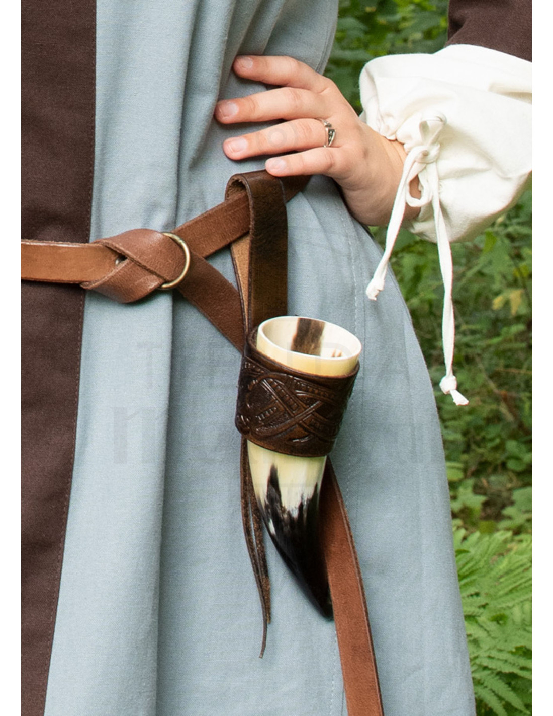 Imagina portar un accesorio que no solo refleja tu estilo personal, sino que también evoca la fuerza y el misterio de antiguas leyendas nórdicas. Este soporte para cuerno de beber en cuero marrón oscuro te permite llevar tu bebida favorita con un toque de elegancia rústica y auténtica tradición.