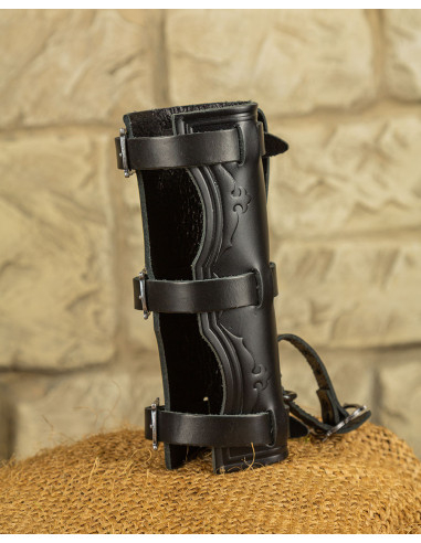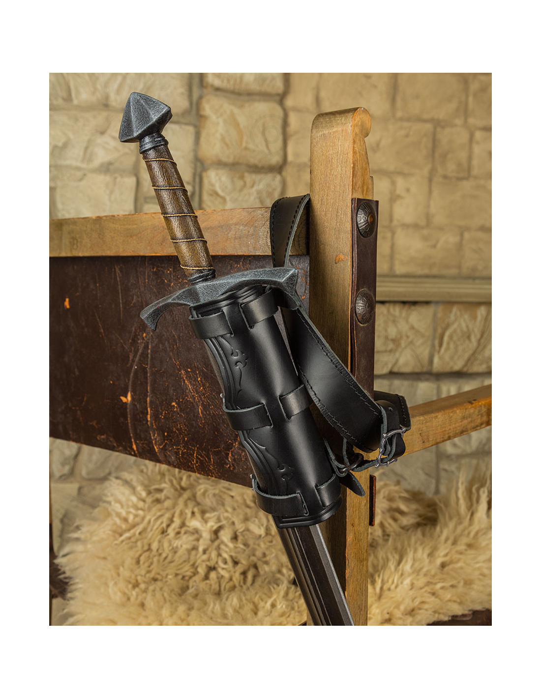 ¿Buscas la forma perfecta de llevar tu espada con estilo y comodidad? Este elegante guardafangos medieval en cuero negro es la opción ideal para quienes valoran la calidad y el diseño impecable. Fabricado por la prestigiosa firma italiana 'Fucina del drago', conocida en Europa como 'Drachenschmiede', con una reputación por sus productos de cuero excepcionales, cada pieza combina durabilidad y artesanía en estado puro.