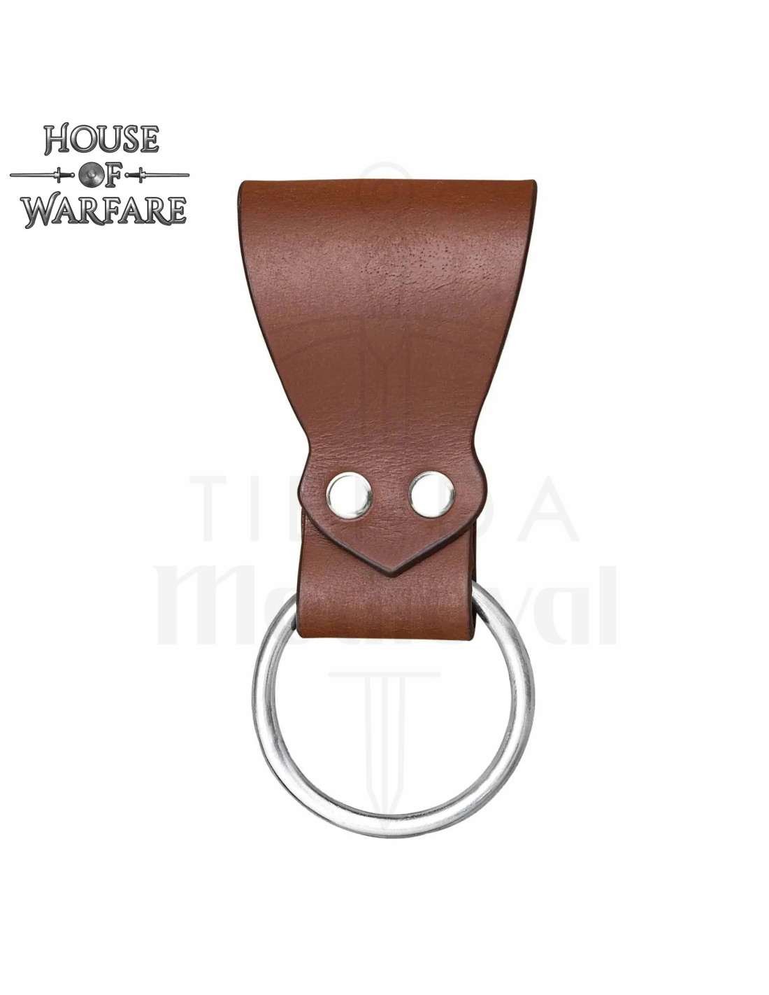 Este accesorio combina cuero marrón de calidad, que puede ser cuero auténtico o una alternativa sintética bien trabajada, con un aro metálico plateado sólido remachado para mayor resistencia. La pieza presenta una paleta cálida y acabados artesanales, con la piel doblada y fijada por dos remaches visibles, aportando un aire clásico y robusto a tu equipo.