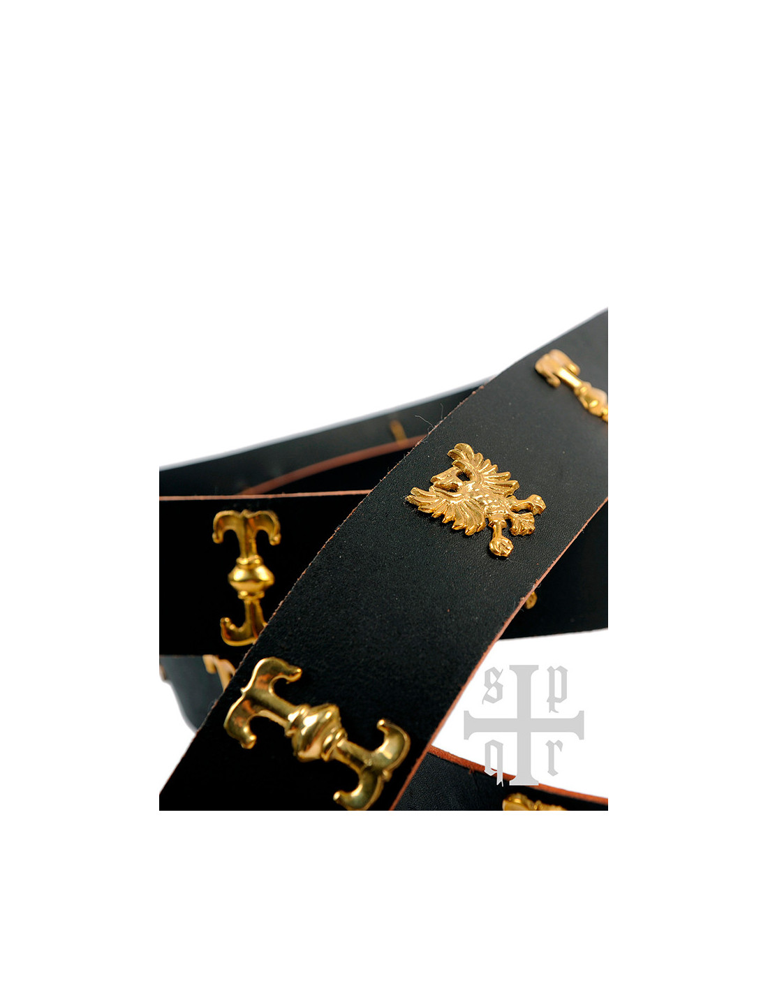Además, el cinturón viene decorado con águilas heráldicas y flor de lis, detalles que reflejan la importancia de la nobleza y la caballería en la época medieval. Todos los accesorios están hechos en latón, un material resistente y duradero que garantiza la calidad de este cinturón.