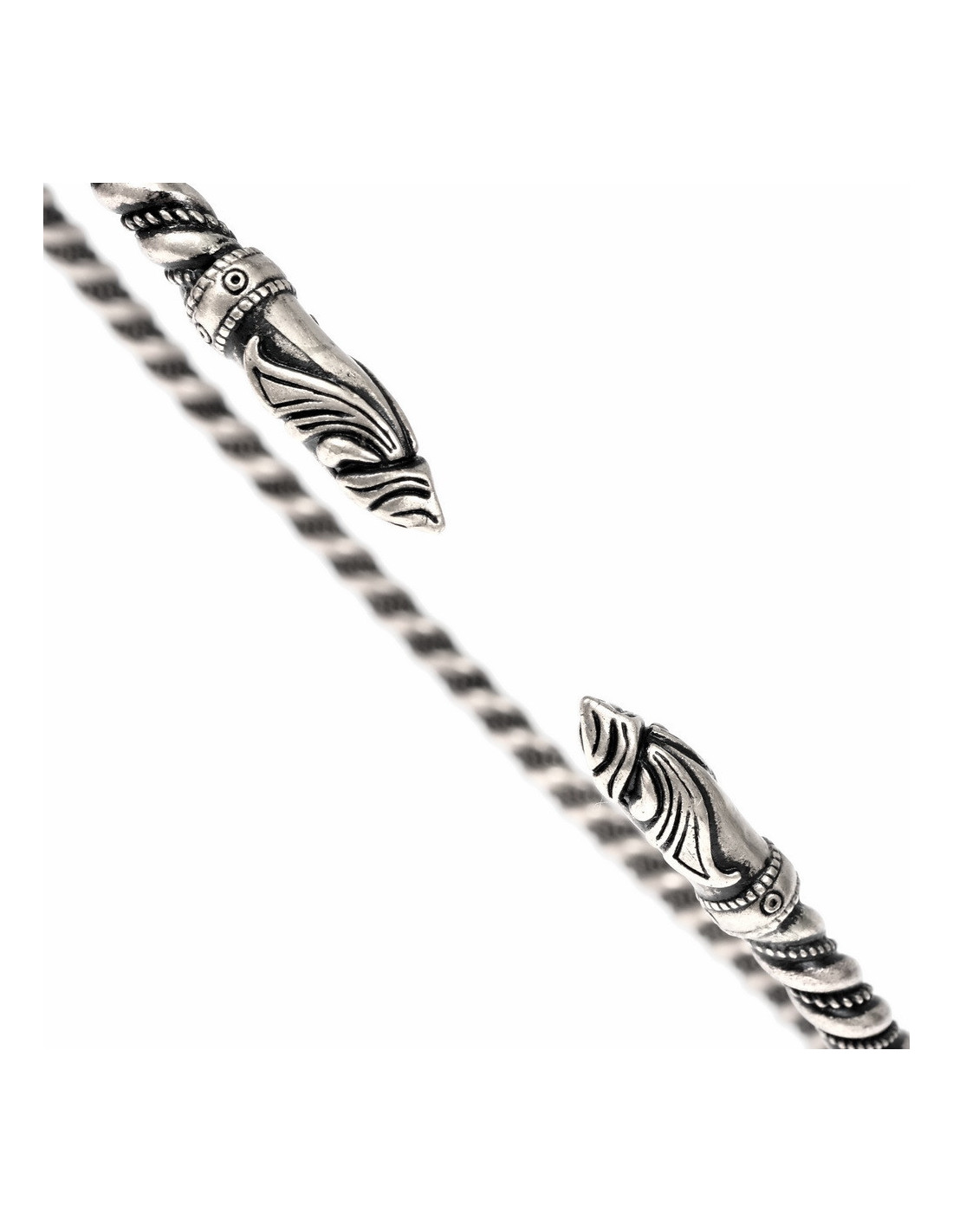 No pierdas la oportunidad de añadir un toque de estilo y carácter a tus outfits diarios con el Torque vikingo con cabezas de cuervos. Disponible en dos opciones de acabado: bronce y plateado, para que elijas la que mejor se adapte a tu estilo personal.