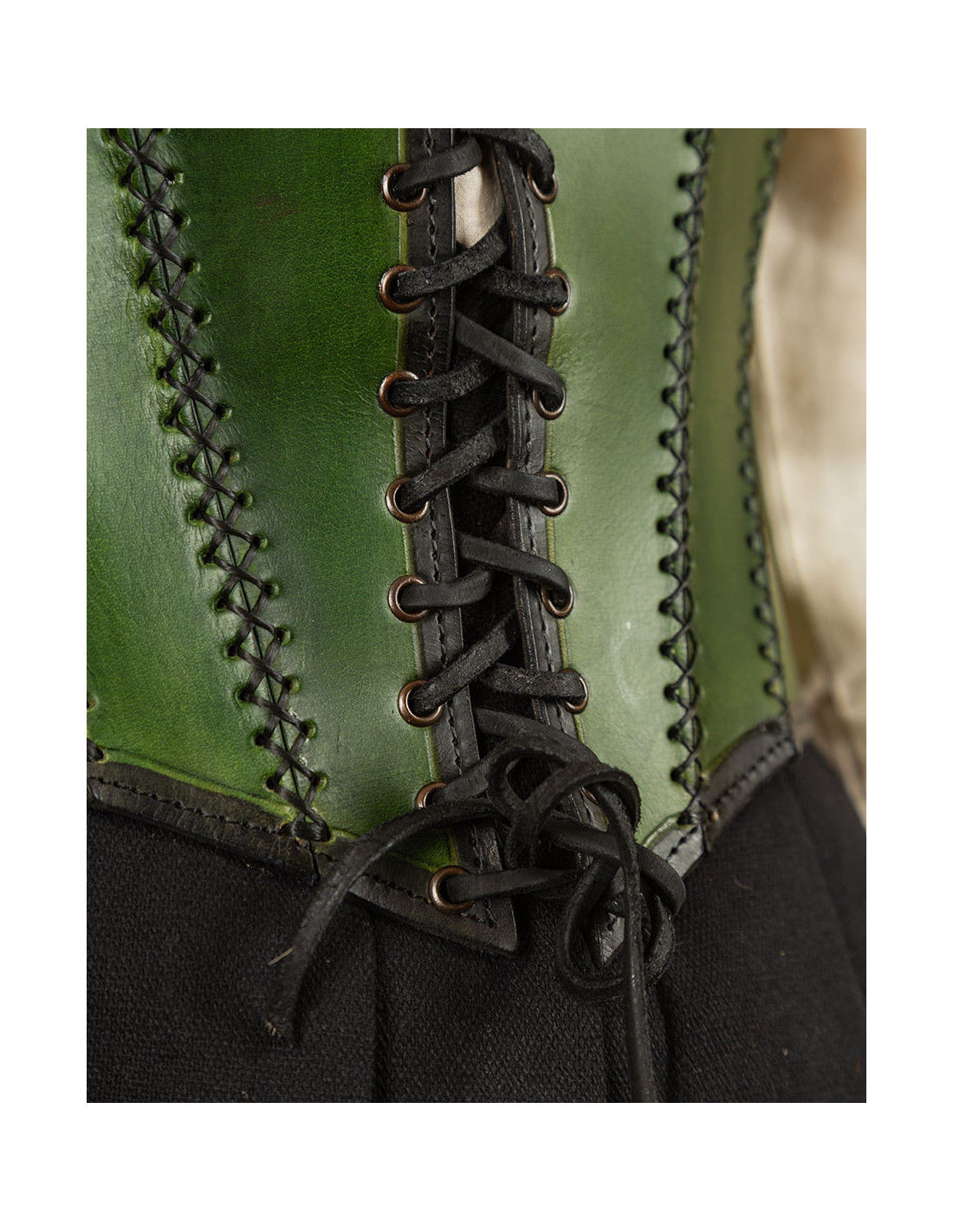 ¿Quieres destacar con un toque medieval lleno de carácter y estilo? Este corsé en cuero de color verde, diseñado por 'Trollfelsen', es la elección perfecta para lucir auténtica y segura en cualquier ocasión. Su acabado en cuero de alta calidad se adapta maravillosamente a tu figura, resaltando tus curvas con elegancia y fuerza.