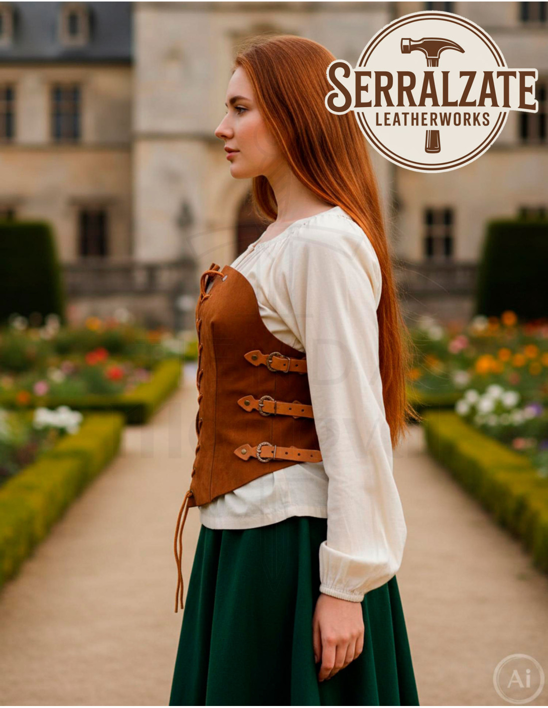 Hecho a mano en España con cuero auténtico de ante en tono marrón claro, ofrece una textura suave y cálida que realza cualquier prenda que lleves debajo, sin restar movilidad. El cierre frontal con cordones y ojales metálicos permite un ajuste preciso y cómodo, para que puedas marcar la silueta que prefieres sin complicaciones.