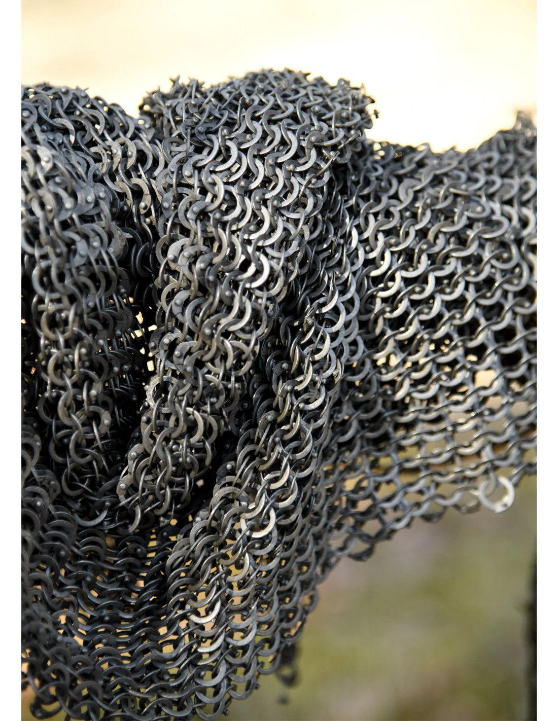 ¿Listo para transformar tu armadura con una pieza que combina tradición y resistencia? Imagina poder equiparte con una protección que ofrece una flexibilidad sorprendente, gracias a un tejido meticuloso hecho de anillas planas remachadas, diseñado para moverse contigo sin perder su solidez.