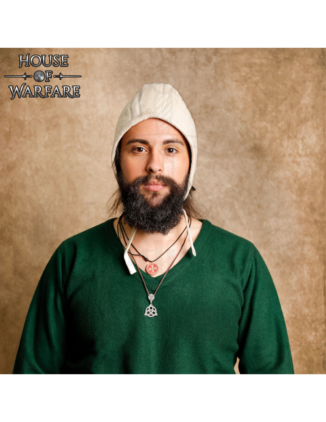 Además, su patrón inspirado en ilustraciones y hallazgos arqueológicos otorga una estética auténtica, y su diseño compacto la hace fácil de llevar bajo cualquier casco, desde cascos grandes hasta casquetes más ligeros. La Crespina medieval acolchada es tu aliada para lograr una apariencia clásica y una protección efectiva en cada aventura o exhibición histórica.