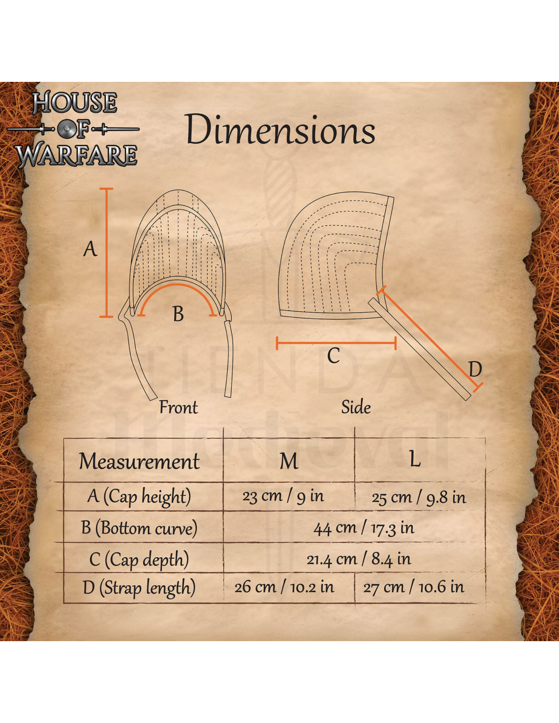 Las correas ajustables bajo la barbilla aseguran un ajuste estable, incluso en movimientos intensos, mientras que la costura reforzada en todas sus zonas refuerza su resistencia a múltiples usos. Ideal para completar conjuntos de armadura, para eventos de LARP, teatro, recreaciones históricas o colecciones de época, esta pieza añade un toque de fidelidad y utilidad.