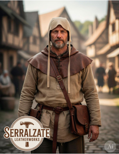 ¡Dale un toque auténtico a tu vestuario medieval con esta elegante capelina de cuero, diseñada para los amantes de la historia y la aventura! Fabricada en suave gamuza en color beige claro, esta pieza combina comodidad y estilo, permitiéndote lucir como un auténtico caballero o dama de época.