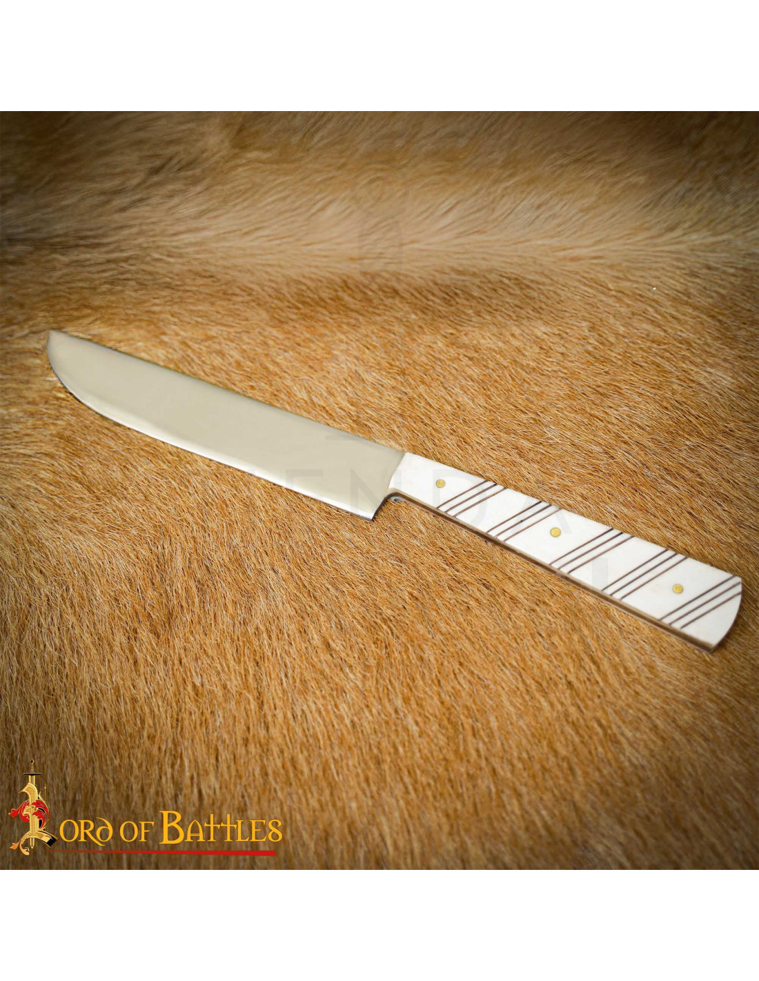 En contexto histórico, los cuchillos personales fueron compañeras indispensables en la Edad Media, usadas a diario en mesas y campamentos. Esta réplica captura esa presencia discreta y práctica, conectando tu mesa con siglos de tradición culinaria y social.