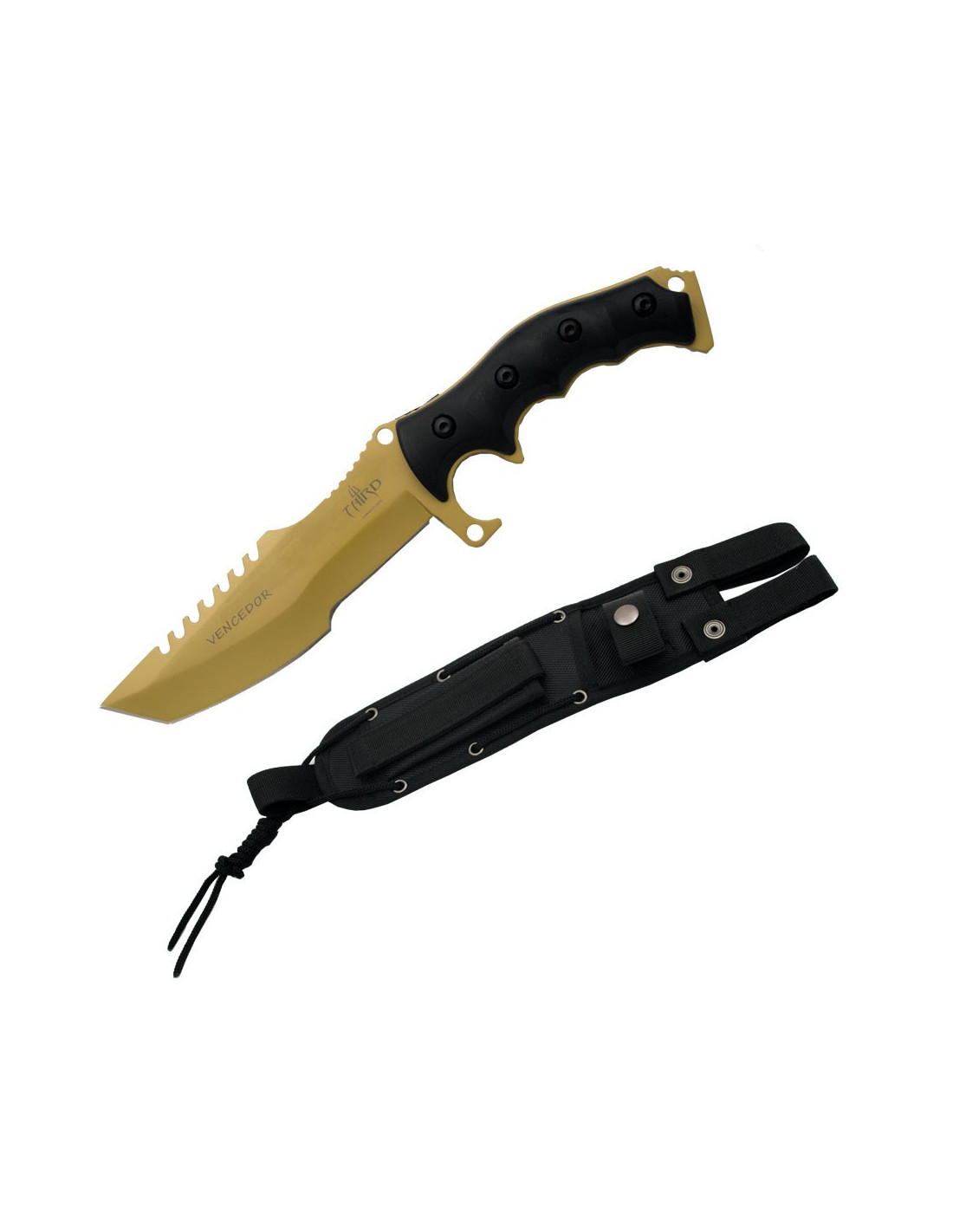 ¿Estás buscando un cuchillo táctico de alta calidad para tus aventuras al aire libre Entonces el cuchillo táctico Vencedor es lo que necesitas. Este cuchillo tiene una hoja de acero inoxidable de alta calidad con un revestimiento Ti-Coating dorado mate para una apariencia impresionante y una mayor resistencia al desgaste. Pero eso no es todo, también viene con un encendedor de magnesio incorporado para ayudarte en situaciones de emergencia.