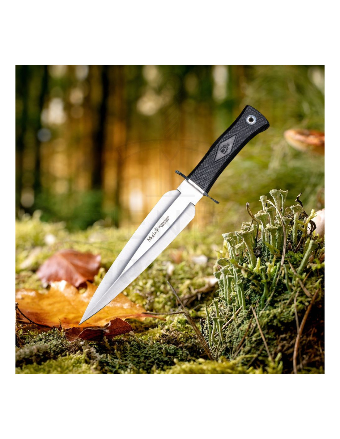 Este cuchillo destaca por su hoja fabricada en acero inoxidable X50CrMoV15, conocida por su resistencia y durabilidad. Con una dureza de 57-58 HRC, ofrece un equilibrio perfecto entre afilado y robustez. Su diseño de hoja enteriza garantiza su solidez, ideal para las exigencias del monte y la caza.